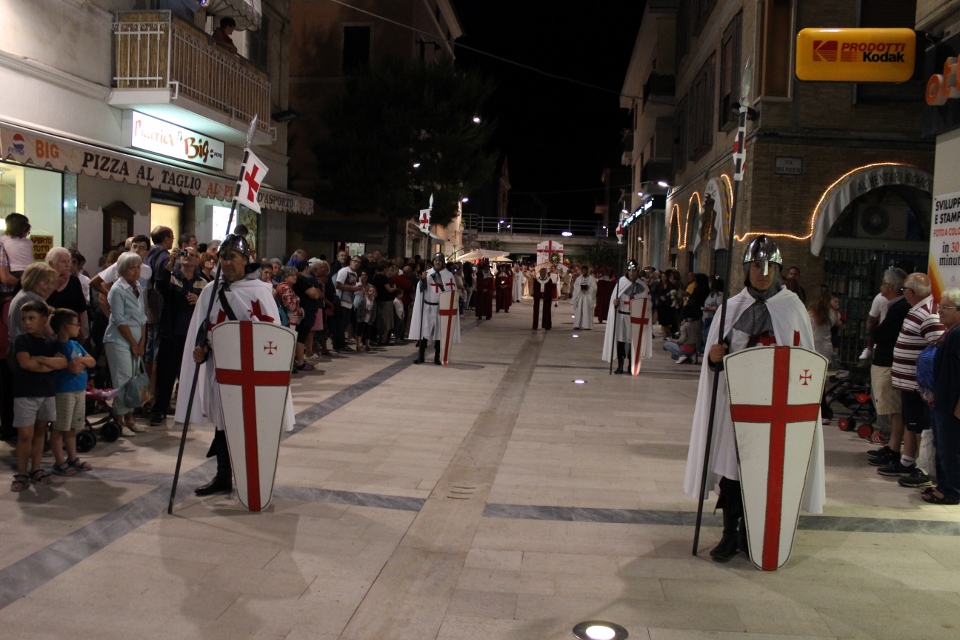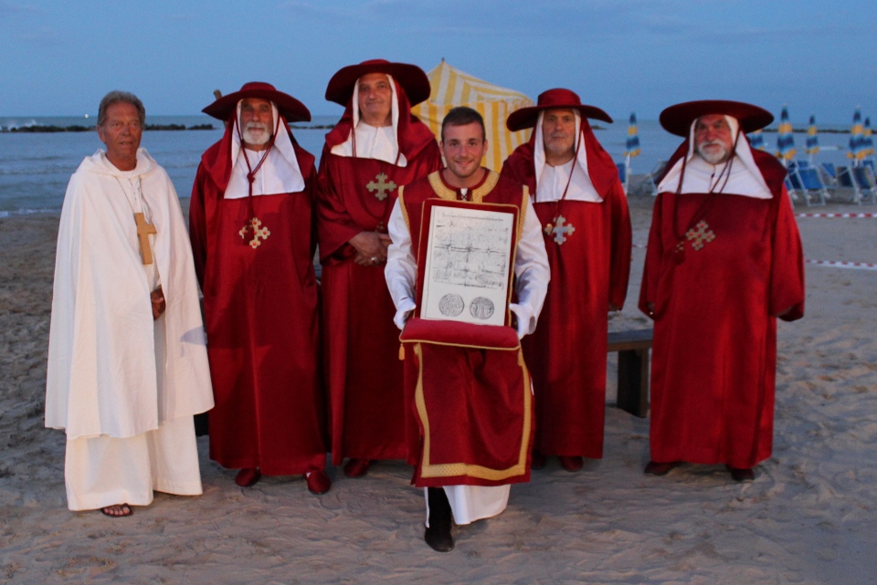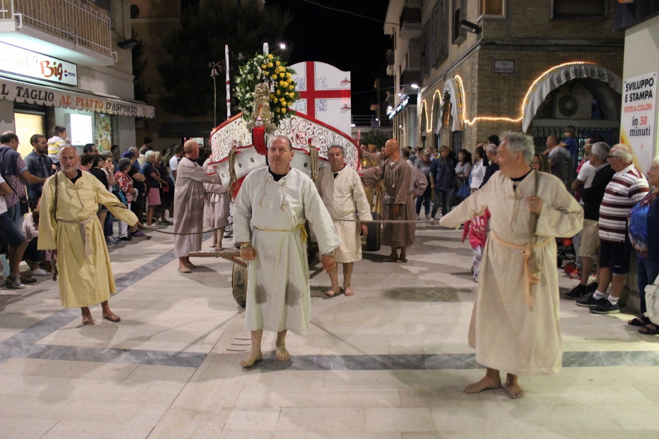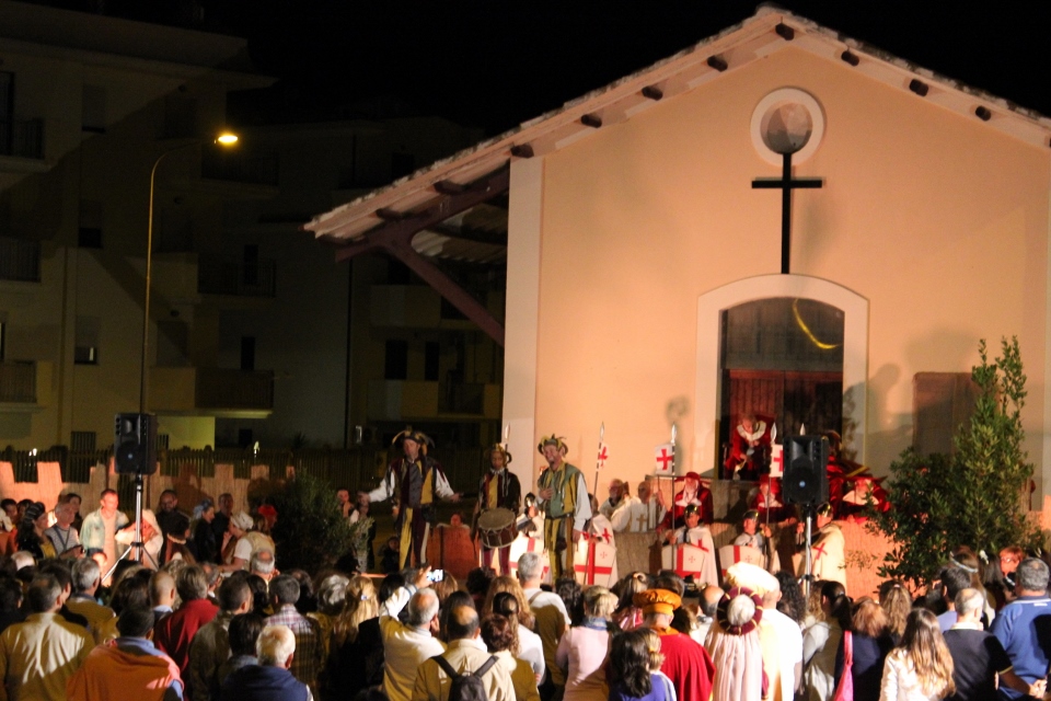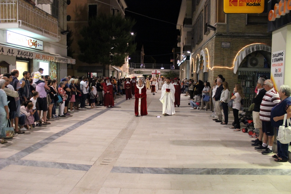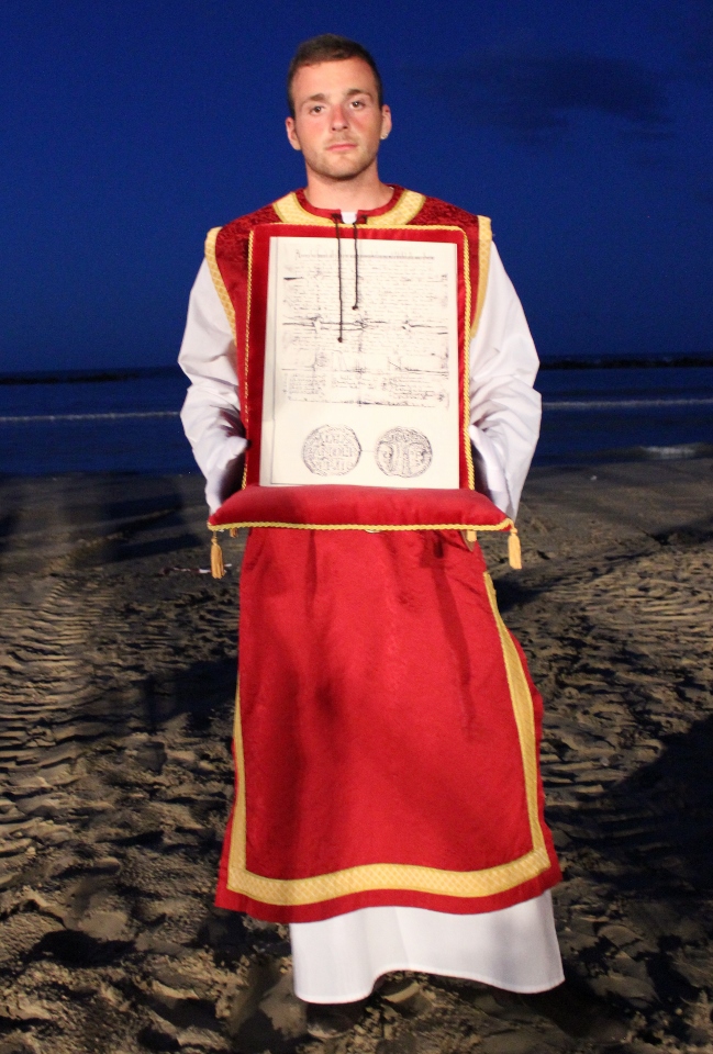 L’applauso festante della gente e dei numerosi turisti ha accolto il figurante che impersonava il pontefice che- secondo la tradizione- nell’alto medioevo sbarcò fortunosamente sul lido di Grottammare all’altezza della foce del Tesino, nei pressi della chiesa abaziale di San Martino. La rievocazione è supportata dall’unico elemento storico più datato, ossia la bolla ottocentesca del vescovo ripano Bartolomeo Bacher, che sancì la storicità della “Sacra Giubilare”, tramandata per generazione, in cui il pontefice promise tante indulgenze per quanti granelli di sabbia contenuti nel suo camauro, ogniqualvolta il 1 luglio fosse capitato di Domenica..