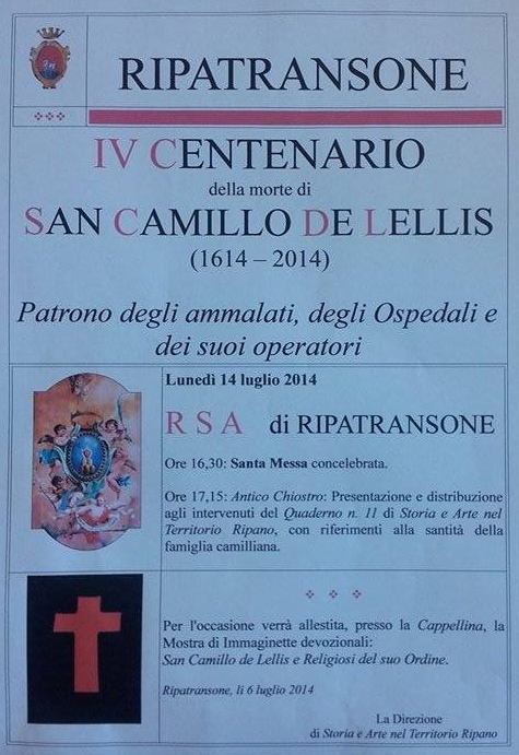 RIPATRANSONE – In occasione del quarto centenario della morte di San Camillo De Lellis, lunedì 14 luglio sarà celebrata una santa messa alle ore 16.30 presso l’RSA di Ripatransone.