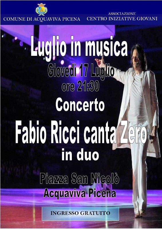 Giovedì 17 luglio è il momento di “Fabio Ricci Canta Zero in duo” che si svolgerà a partire dalle ore 21,30 in piazza San Nicolò (ingresso gratuito). Protagonista della serata il noto artista romagnolo Fabio Ricci la cui particolare somiglianza fisica e una serie di costumi originali oltre una voce molto simile a quella di Renato Zero hanno permesso di riscuotere successo negli ultimi anni nelle varie esibizioni che ha tenuto in varie zone dell’Italia in piazze e teatri di centri delle regioni Emilia Romagna, Marche, Abruzzo, Umbria, Lazio, Puglia, Calabria e Basilicata con lo spettacolo “Fabio Ricci canta zero”.