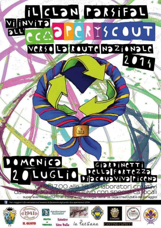 ACQUAVIVA PICENA – Il giorno 20 Luglio 2014 il clan “Parsifal” del gruppo scout Acquaviva 1 organizza l’eco-aperiscout, evento completamente gratuito in preparazione della route nazionale 2014, presso il parco comunale “Fabrizio De Andrè” (giardinetti sotto la fortezza) di Acquaviva Picena dalle ore 17:00 in poi. L’ evento rappresenta la conclusione della preparazione degli scout per la Route Nazionale che si terrà tra le Marche e San Rossore (PI) dal 1 al 10 Agosto 2014. Il tema scelto e affrontato durante tutto l’anno è stato “il coraggio di essere cittadini”, gli scout si sono concentrati in particolar modo sul concetto di “bene comune” con un lavoro che li ha portati a comprendere che proprio Acquaviva Picena è il bene comune e che il modo migliore per tutelarla è partire dalla cura della natura e dell’ambiente. In occasione di questo evento verrà presentato un opuscolo in cui sono riassunte informazioni basilari per effettuare al meglio la raccolta differenziata e verrà “inaugurato” un cestino in legno realizzato dal Clan. Secondo il programma dalle ore 17 alle 18:30 si terranno dei laboratori creativi dedicati a bambini e ragazzi per la realizzazione di porta candele con lattine, fiori con bottiglie di plastica e con rotolini di cartone. Dalle 18:30 in poi si potrà gustare l’aperitivo con specialità locali gentilmente offerte da tantissimi ristoranti e attività di Acquaviva! Ci saranno, inoltre, delle esposizioni artistiche di quadri e disegni, a tale proposito gli scout invitano artisti, acquavivani e non, che abbiano voglia di approfittare di questo evento per esporre le loro opere, di qualsiasi cosa si tratti (disegni, dipinti, foto, oggetti hand-made, fumetti, sculture etc.).