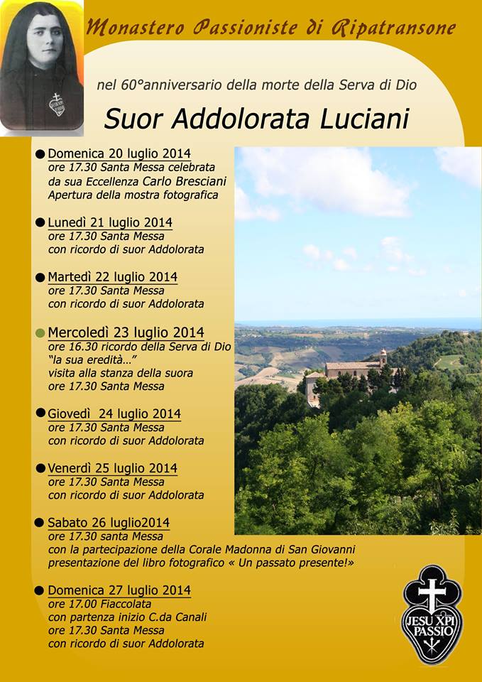 RIPATRANSONE – Per ricordare la Serva di Dio Sr Addolorata Luciani nel 60° anniversario della sua morte il Monastero delle Passioniste di Ripatransone ha organizzato una serie di iniziative, a seguire il programma: