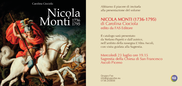 ASCOLI PICENO – Il Gruppo Fas invita alla presentazione del volume Nicola Monti (1736-1795) di Carolina Ciociola, in programma mercoledì 23 luglio alle ore 19.15 presso la Sagrestia della Chiesa di San Francesco, ad Ascoli Piceno. Interverrà il Professor Stefano Papetti. Il catalogo sarà presentato nel corso dell’intervento “Mecenatismo pubblico privato dal Rinascimento all’Unità d’Italia”, a cura di Carolina Ciociola e Stefano Papetti, e si colloca nell’ambito della rassegna “L’Altra Italia-L’Altra Ascoli”, promossa dall’Amministrazione Comunale di Ascoli Piceno. La presentazione seguirà la visita guidata alla Sagrestia.