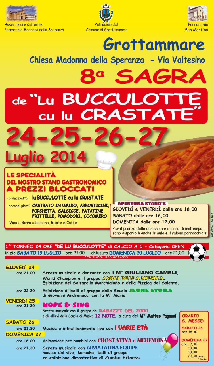 GROTTAMMARE – Da oggi torna la regina delle Sagre, la tradizionale Sagra de Lu Bucculotte cu lu Crastate, ormai giunta alla sua 8^ edizione; organizzata dal comitato Madonna della Speranza è ormai uno degli eventi di spicco del calendario estivo del Comune di Grottammare. All’interno della sagra anche il torneo 24 ore di calcetto.