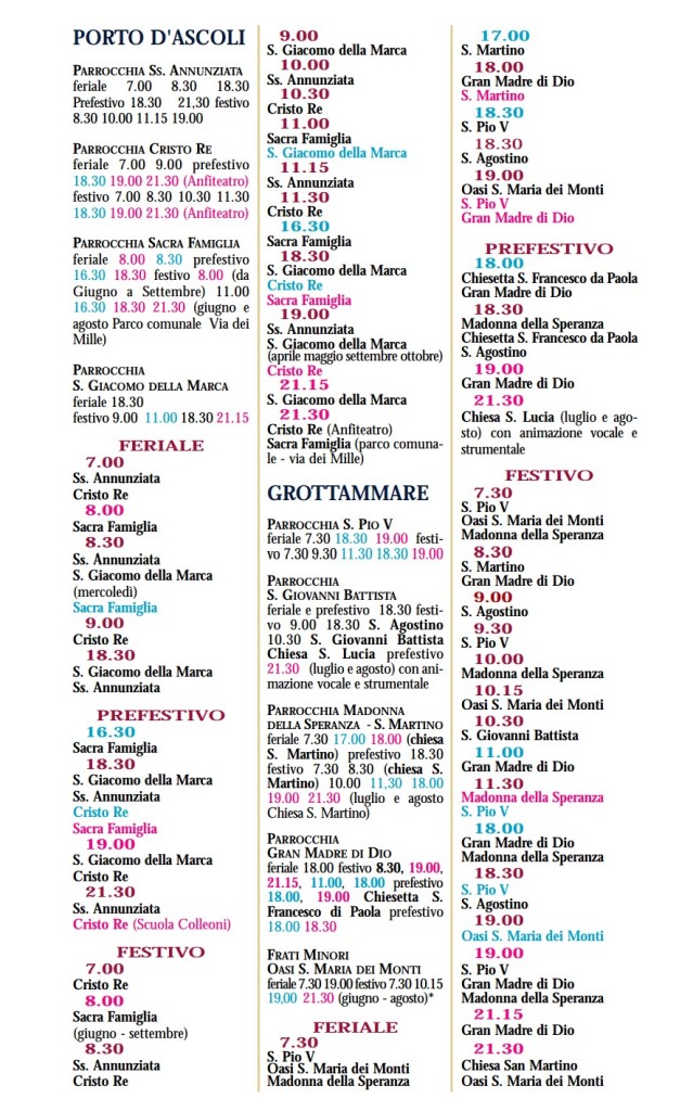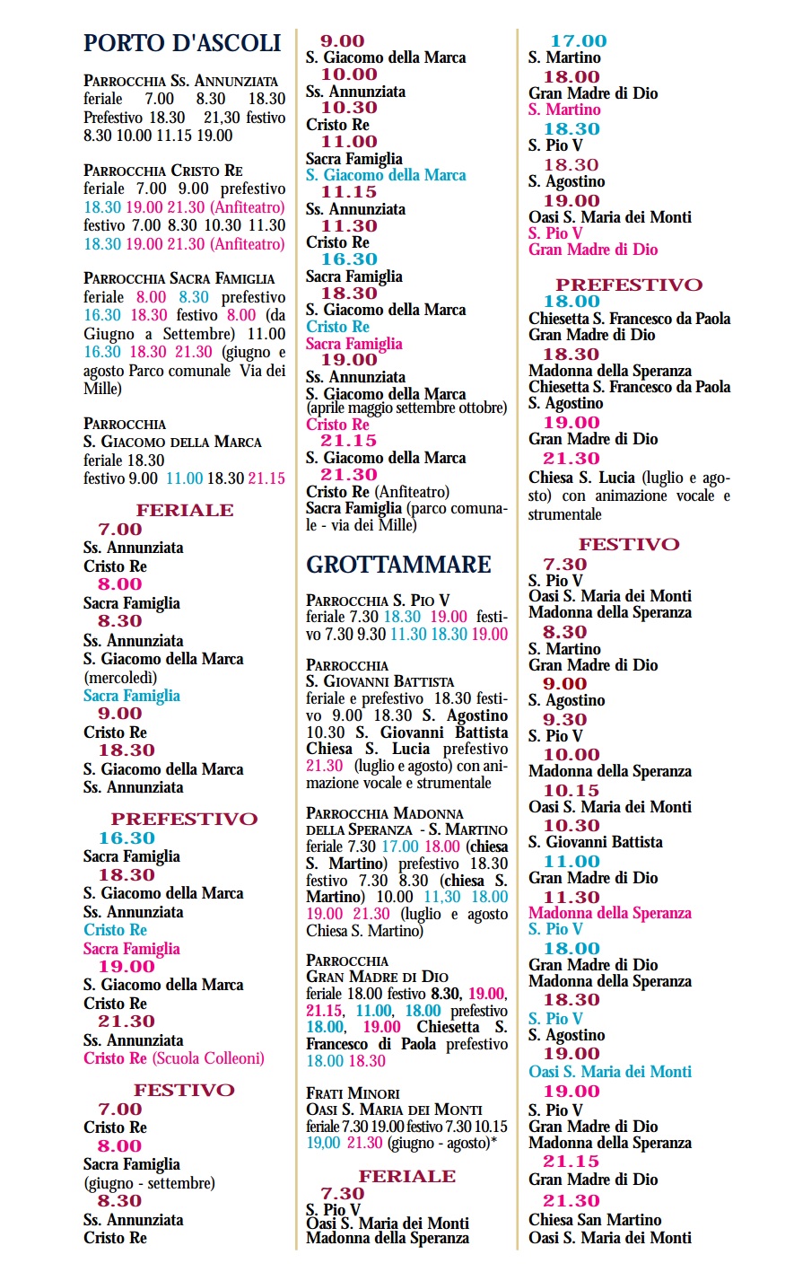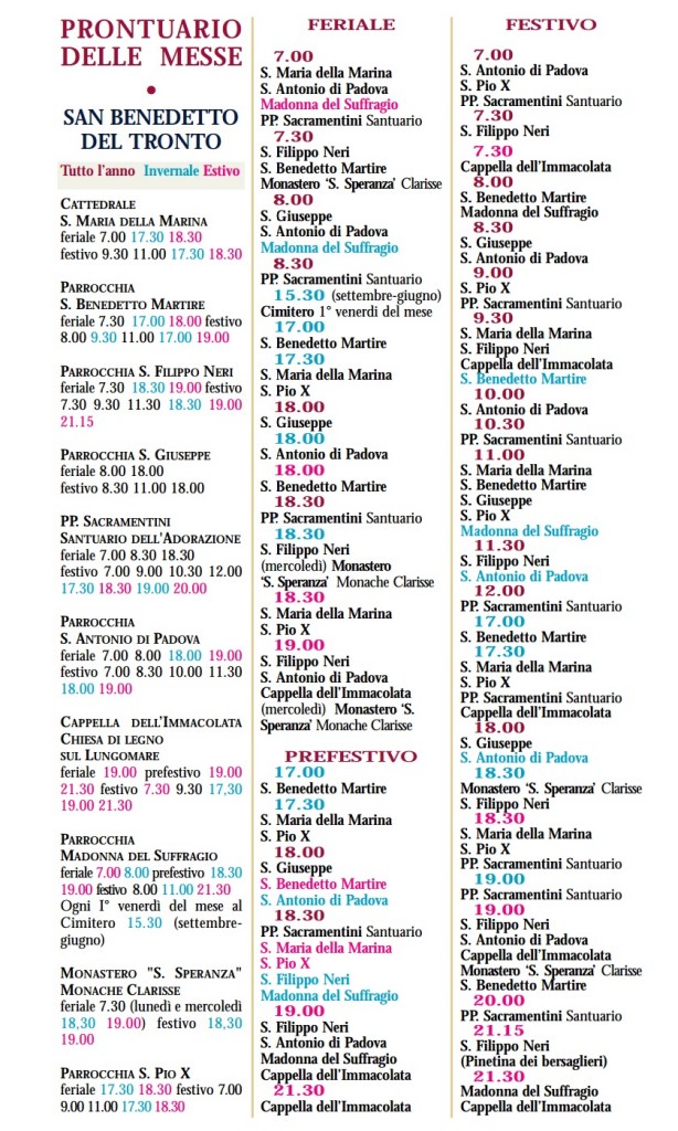 Buongiorno, Mi sembrano pico chiari i simboli e colori per gli orari stagionali. Sarebbe possibile precisare meglio se per la stagionalità ci si deve riferire al colore dell'orario o anche al colore della parrocchia?. Inolte un altro suggerimento:sarebbe possibile che ogni chiesa avesse esposto l'orario delle sante messe di tutto il decanato? Magari in una bacheca esterna che si possa consultare anche in orari in cui la Chiesa è chiusa? Ringrazio soprattutto per l'accoglienza e la grande ospitalità della Chiesa Marchigiana. Luigi. Diocesi di Trento