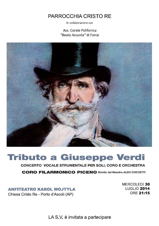 PORTO D’ASCOLI – La parrocchia “Cristo Re” di Porto d’Ascoli in collaborazione con l’associazione Corale Polifonica “Beata Assunta” di Force organizzano un “Tributo a Giuseppe Verdi”. Mercoledì 30 luglio, alle 21,15, nell’anfiteatro “Karol Wojtyla” della parrocchia di Cristo Re si terrà un concerto vocale strumentale per solo coro e orchestra tenuto dal Coro filarmonico Piceno diretto dal Maestro Aldo Coccetti. Il concerto è gratuito. La cittadinanza è invitata a partecipare.