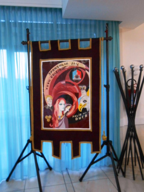 Durante la serata è stato presentato il drappo Sponsalia 2014, quest’anno dipinto dall’artista Sgolacchia Teresita di Montecassiano. Nel dipinto, in cui predomina il colore rosso, sono presenti tutti gli elementi che rappresentano la rievocazione storica e l’antico borgo di Acquaviva, a partire dagli sposi Forasteria e Rinaldo, vegliati dalla figura di San Niccolò, patrono del paese, con, in basso a sinistra, le tre palle d’oro che fanno parte dell’iconografia del santo; in alto a destra lo stemma comunale e gli animali simboli dei due rioni che si sfideranno durante il Palio: l’aquila e la civetta.