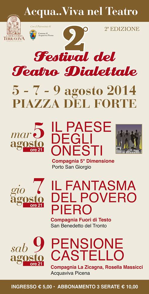 ACQUAVIVA PICENA – Acquaviva si prepara al Fesival del Teatro Dialettale organizzato dall’associazione Laboratorio Terraviva con il Patrocinio del Comune di Acquaviva Picena. Tre le serate che avranno come protagoniste tre compagnie teatrali: la Compagnia 5° Dimensione di Porto San Giorgio che metterà in scena “Il Pese degli Onesti” martedì 5 agosto, la Compagnia Fuori di Testo di San Benedetto del Tronto che metterà in scena “Il Fantasma del Povero Piero” giovedì 7 agosto e non poteva mancare la Compagnia La Zicagna, Rosella Massicci di Acquaviva Picena con il bis di “Pensione Castello” sabato 9 agosto. Teatro del Festival dialettale sarà Piazza del Forte, ai piedi dell’incantevole Fortezza, alle ore 21. Ingresso 5 euro, abbonamento 3 serate 10 euro.