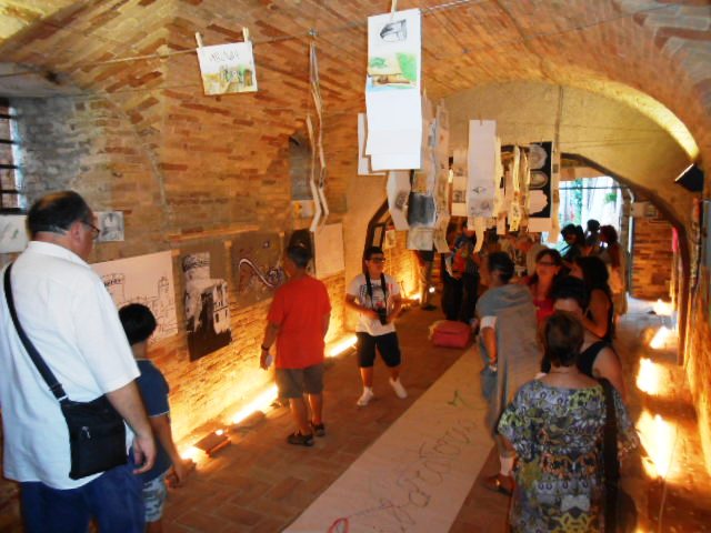 Il concorso ha coinvolto circa 120 studenti dei Licei Artistici di Ascoli e Fermo, dal II al IV anno, ed è stato suddiviso in due sezioni, una lettura d’immagine e una extempore, come spiegato dall’architetto Adele Ciarrocchi, curatrice dell’evento: “Il concorso presenta due sezioni. La sezione A, che ormai si svolge da sette anni, è caratterizzata dagli extempore. I ragazzi dei Licei aderenti all’iniziativa hanno l’opportunità di riprodurre scorci di abitato dopo una breve guida turistica del paese. E’ un momento di forte aggregazione e socializzazione con gli abitanti. Un momento in cui cominciano a conoscere e a farsi interrogare dal paese, dalle vie, cercando di captare segnali che ancora questo piccolo borgo riesce a mandare, anche nel silenzio delle vie e nei momenti più assolati. Questi elaborati hanno restituito delle emozioni e una forte sensibilità di lettura di questi giovani che a noi ha fatto molto piacere, sia perché questo significa che non ci lasciamo dominare soltanto da immagini ma che sappiamo andare a cercarle e caratterizzarle, sia perché resta ancora quel pizzico di curiosità che ci aiuta e ci stimola alla conoscenza, al voler capire che cosa abbiamo di fronte e quindi a poter crescere attraverso le informazioni che l’intorno ci restituisce. Quest’anno il tema è stato incentrato sulle porte di Acquaviva Picena, quindi i ragazzi sono stati dotati di una piccola mappa con un percorso indicativo e la segnalazione delle varie porte; due i punti di vista attraverso i quali guardare il soggetto: il rapporto interno alla città, cioè la vista interna, la porta che accoglie all’interno, e allo stesso tempo il taglio verso l’esterno, quello di un paese arroccato su una collina che però ha delle fessure, dei tagli visuali verso un notevole paesaggio agrario che fa ancora parte dell’economia del paese, ancora abbastanza incontaminato e caratterizzato da radure, boschetti e fossati. La sezione B nasce dalle ceneri della sezione di mail-art e proponeva dei tagli fotografici, scelti dall’Associazione Laboratorio Terraviva, come punto di partenza per elaborati pittorici da realizzare all’interno di programmi didattici e/o a casa, in maniera più riflessiva e personalizzata; i ragazzi hanno elaborato delle opere con le tecniche più congeniali a loro, in base alla propria sensibilità”.
