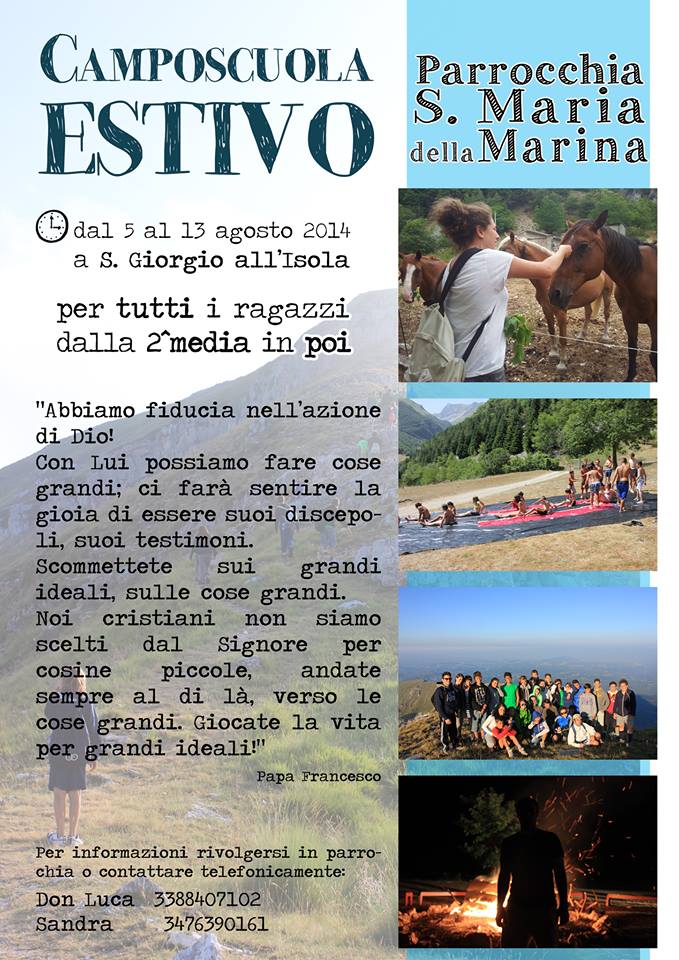 SAN BENEDETTO DEL TRONTO – Le chitarre sono state accordate, le iscrizioni chiuse, i giochi preparati, mancano solo le valigie e caricare il pullmino…per il camposcuola della parrocchia della Marina! Dal 5 al 13 agosto circa 40 ragazzi di età compresa tra i 12 e i 16 anni partiranno alla volta di S. Giorgio all’Isola per vivere una meravigliosa settimana nel cuore del parco dei Sibillini. I ragazzi verranno divisi in squadre, che a turno dovranno prendersi cura della casa attraverso la preparazione della tavola per i pasti, la pulizia delle camere, dei bagni e del campo, la preparazione della liturgia eucaristica.