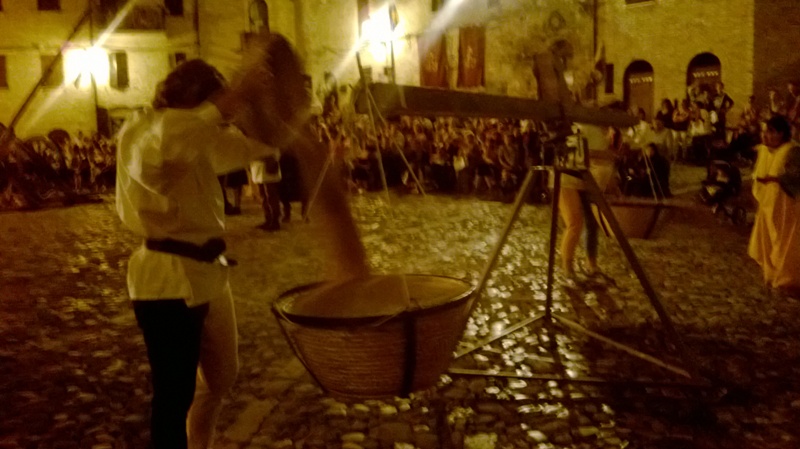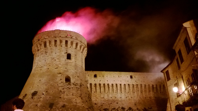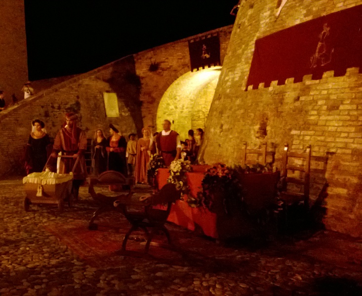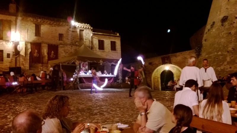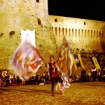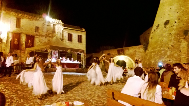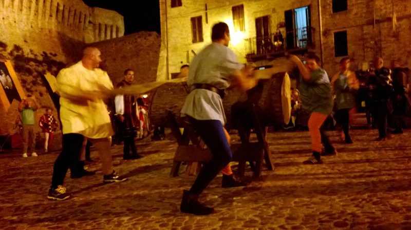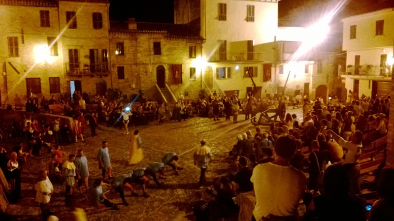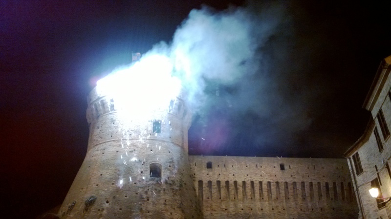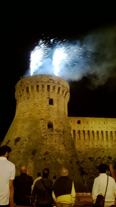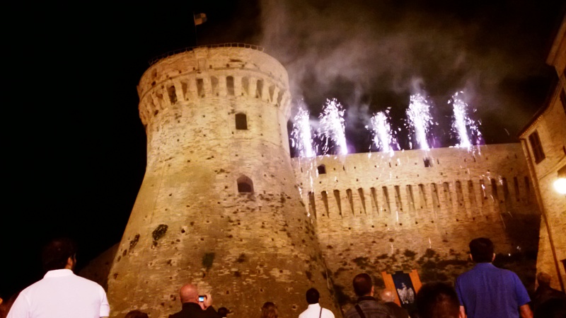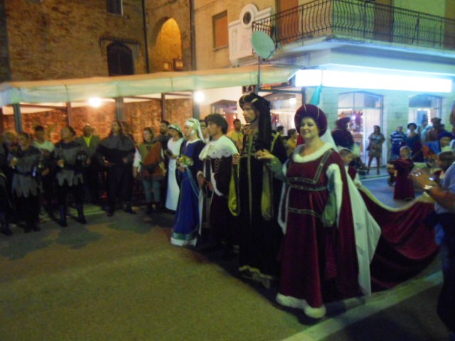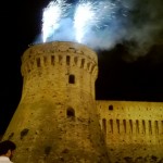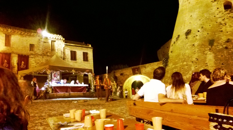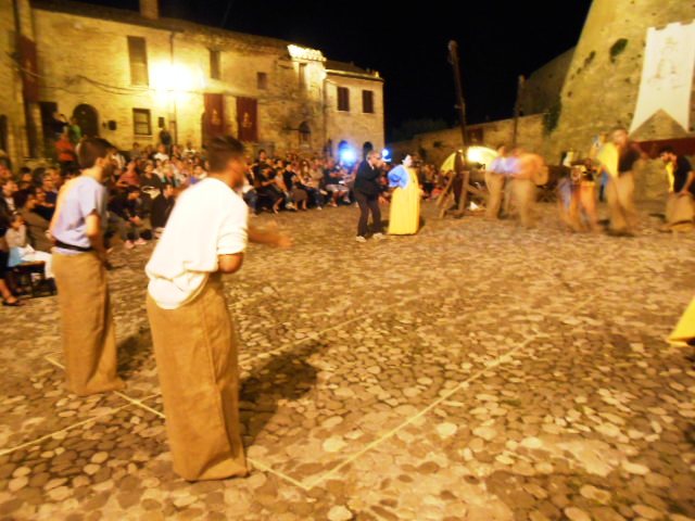 Infine domenica 3 agosto si è tenuto il rinomato Banchetto Nuziale in una nuova e suggestiva location: piazza del Forte, sotto la splendida Fortezza capolavoro del Pontelli. Cena bagnata, cena fortunata ha detto Fabio di Cocco, il giullare della serata, e tanto è stato: nonostante lo scroscio d’acqua iniziale organizzatori e partecipanti non si sono scoraggiati: appena smesso di piovere i camerieri si sono subito dati da fare per togliere le tovaglie bagnate e asciugare le panche nel minor tempo possibile, l’organizzazione ha saputo far fronte egregiamente all’inconveniente con molto senso pratico. I partecipanti alla cena, oltre 200, si sono potuti, quindi, accomodare di nuovo per iniziare la cena a partire dalla frutta e dal pinzimonio, come tutti gli anni, per poi gustare piatti come zuppa di ceci con vongole e gamberi o bocconcini di vitello con crema di fave, per nominare due tra le diverse deliziose pietanze preparate dal Catering Papillon, per terminare in dolcezza con i biscotti di Forasteria e il vino cotto. La serata è stata molto vivace grazie all’animazione degli Armigeri e Balestrieri di Bucchianico con la loro gogna che ha mietuto diverse vittime, degli Errabundi musici, della danzatrice del ventre Perla d’Oriente, dei Lux Arcana con il loro spettacolo di fuoco, dell’esibizione del balletto medievale delle alunne della maestra di danza Maria Luigia Neroni e del gioco del Mercante in Fiera dove come carte sono stati utilizzati dei disegni di personaggi del Palio realizzati dall’artista Cesare d’Antonio. Al termine del banchetto si è tenuto il tradizionale incendio della Fortezza, con uno spettacolo firmato Pirotecnica 2001, che ha concluso degnamente l’ultima serata dell’edizione 2014 di Sponsalia.