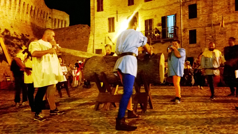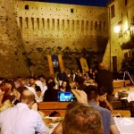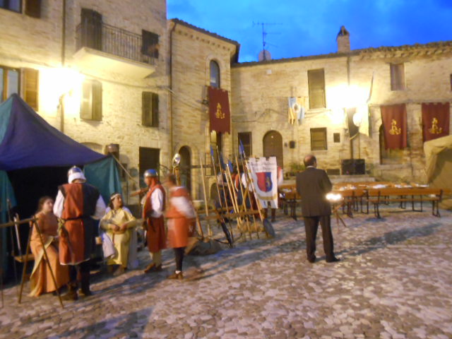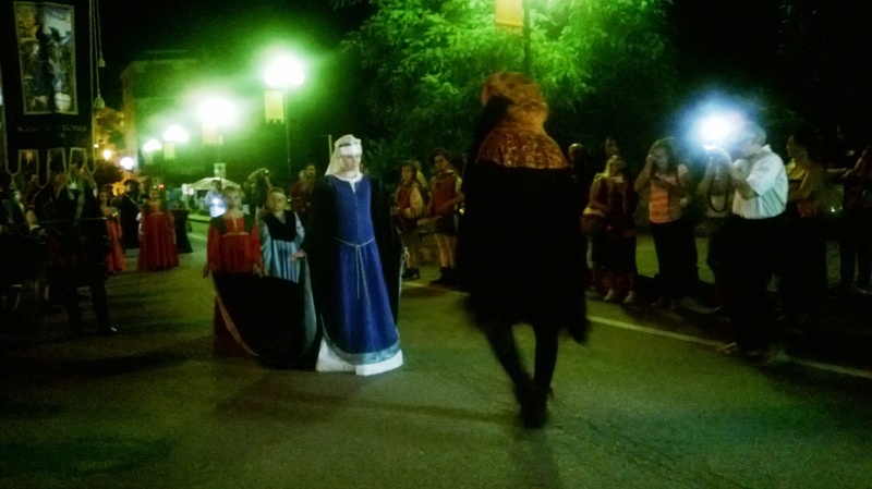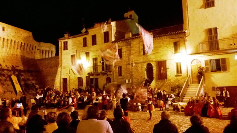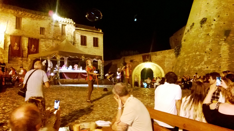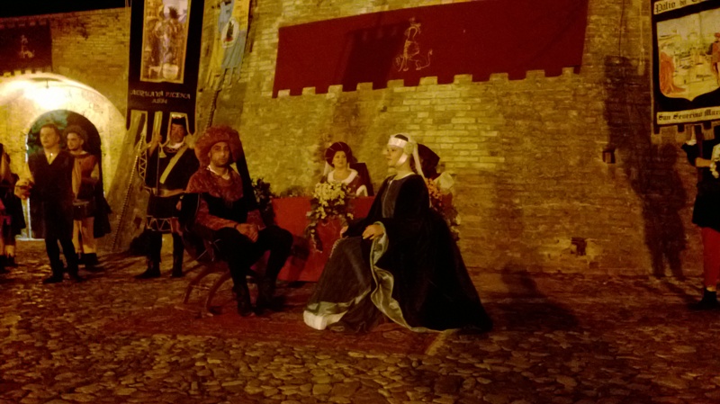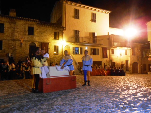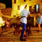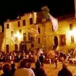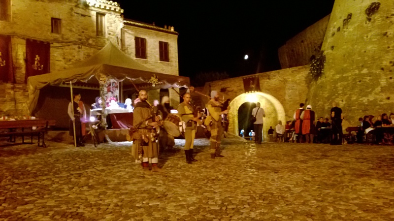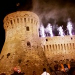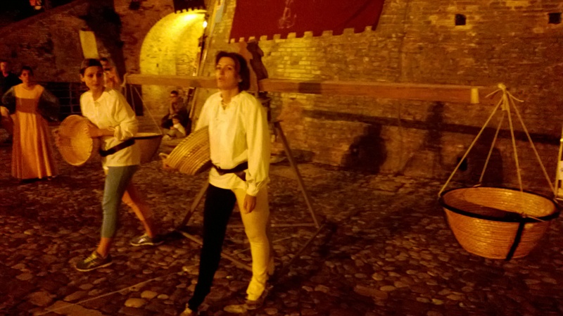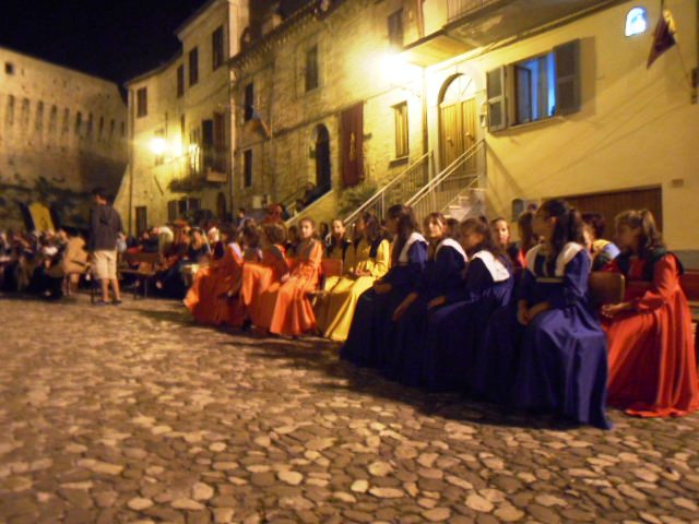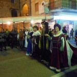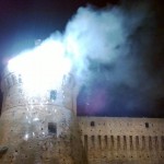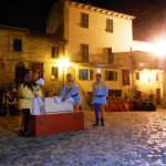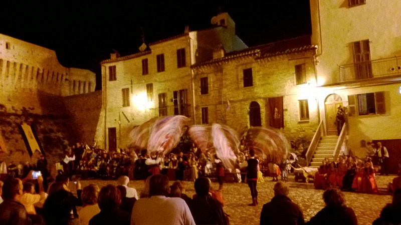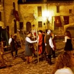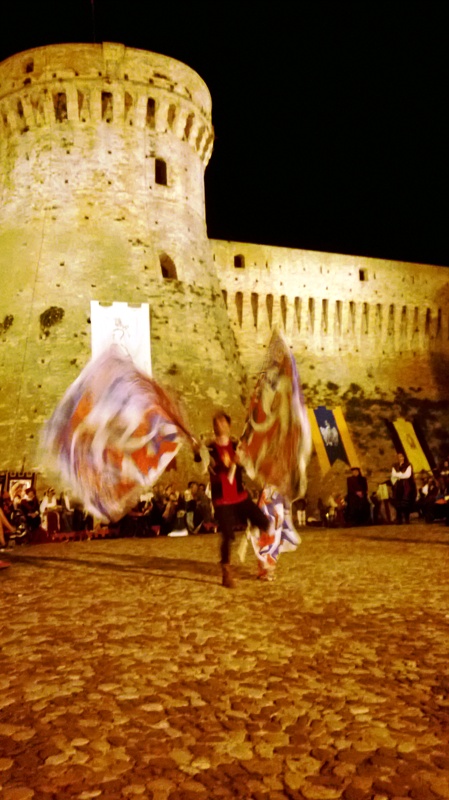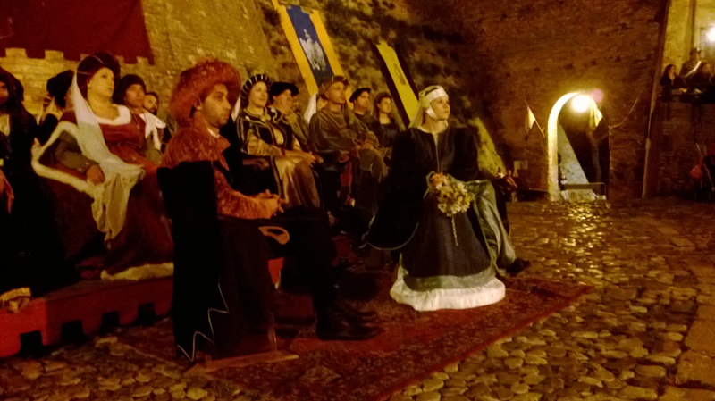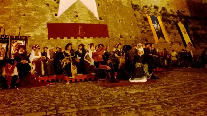 Infine domenica 3 agosto si è tenuto il rinomato Banchetto Nuziale in una nuova e suggestiva location: piazza del Forte, sotto la splendida Fortezza capolavoro del Pontelli. Cena bagnata, cena fortunata ha detto Fabio di Cocco, il giullare della serata, e tanto è stato: nonostante lo scroscio d’acqua iniziale organizzatori e partecipanti non si sono scoraggiati: appena smesso di piovere i camerieri si sono subito dati da fare per togliere le tovaglie bagnate e asciugare le panche nel minor tempo possibile, l’organizzazione ha saputo far fronte egregiamente all’inconveniente con molto senso pratico. I partecipanti alla cena, oltre 200, si sono potuti, quindi, accomodare di nuovo per iniziare la cena a partire dalla frutta e dal pinzimonio, come tutti gli anni, per poi gustare piatti come zuppa di ceci con vongole e gamberi o bocconcini di vitello con crema di fave, per nominare due tra le diverse deliziose pietanze preparate dal Catering Papillon, per terminare in dolcezza con i biscotti di Forasteria e il vino cotto. La serata è stata molto vivace grazie all’animazione degli Armigeri e Balestrieri di Bucchianico con la loro gogna che ha mietuto diverse vittime, degli Errabundi musici, della danzatrice del ventre Perla d’Oriente, dei Lux Arcana con il loro spettacolo di fuoco, dell’esibizione del balletto medievale delle alunne della maestra di danza Maria Luigia Neroni e del gioco del Mercante in Fiera dove come carte sono stati utilizzati dei disegni di personaggi del Palio realizzati dall’artista Cesare d’Antonio. Al termine del banchetto si è tenuto il tradizionale incendio della Fortezza, con uno spettacolo firmato Pirotecnica 2001, che ha concluso degnamente l’ultima serata dell’edizione 2014 di Sponsalia.
