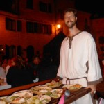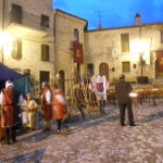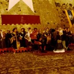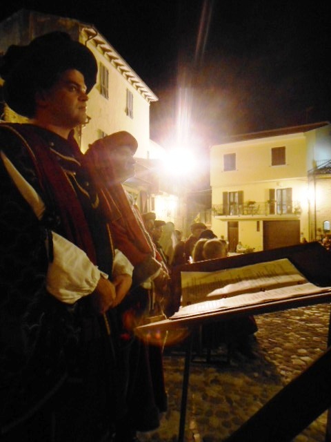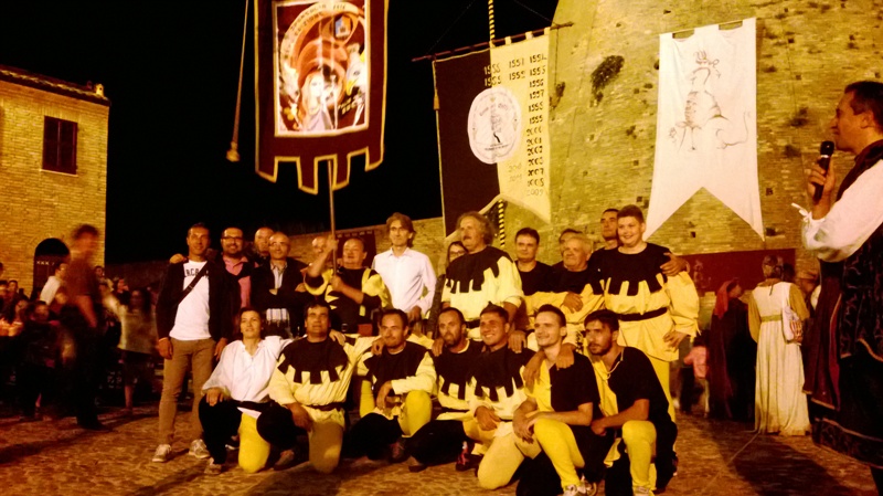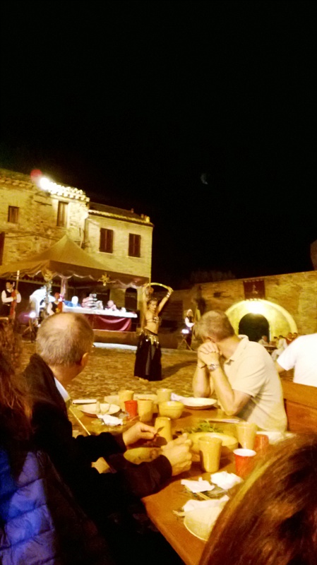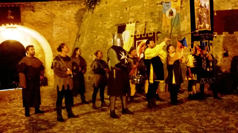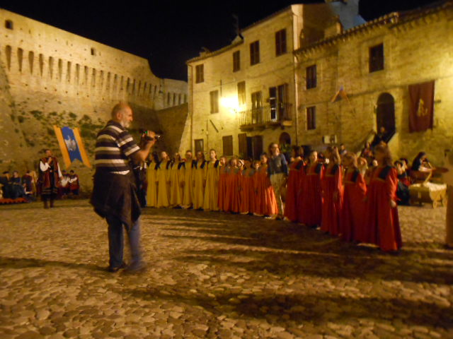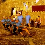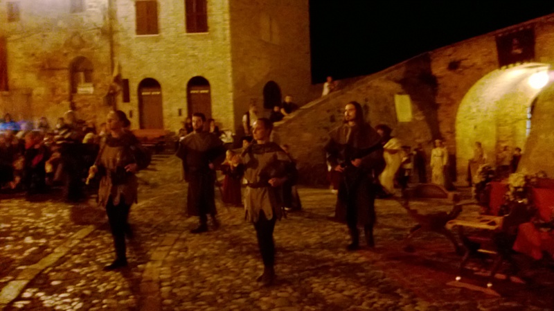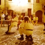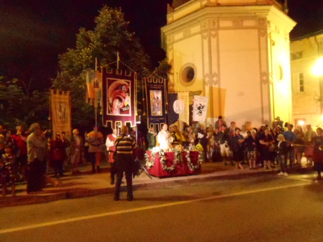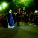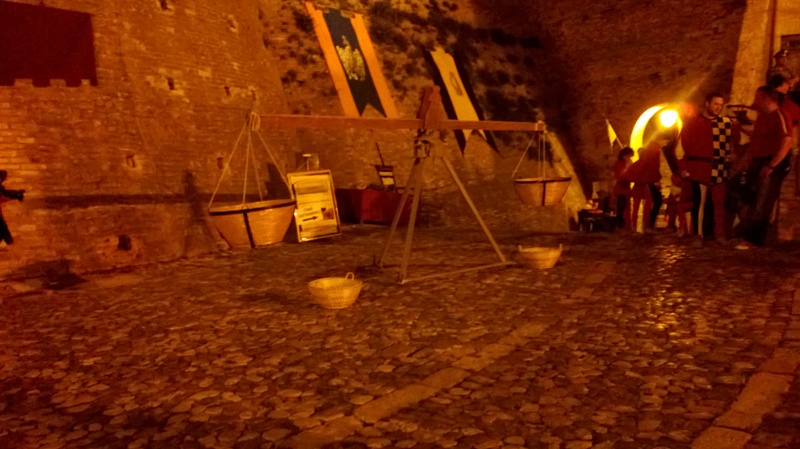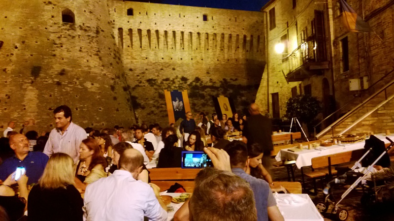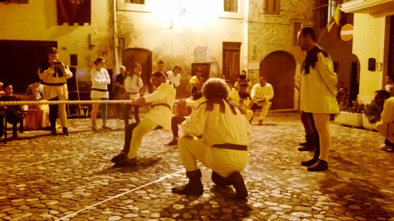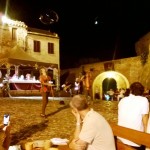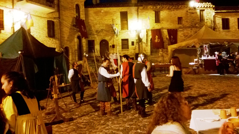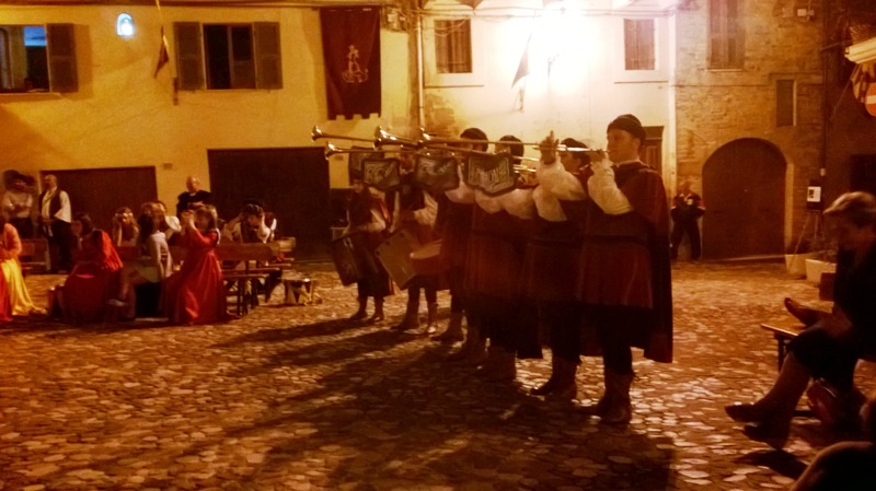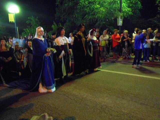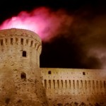 Infine domenica 3 agosto si è tenuto il rinomato Banchetto Nuziale in una nuova e suggestiva location: piazza del Forte, sotto la splendida Fortezza capolavoro del Pontelli. Cena bagnata, cena fortunata ha detto Fabio di Cocco, il giullare della serata, e tanto è stato: nonostante lo scroscio d’acqua iniziale organizzatori e partecipanti non si sono scoraggiati: appena smesso di piovere i camerieri si sono subito dati da fare per togliere le tovaglie bagnate e asciugare le panche nel minor tempo possibile, l’organizzazione ha saputo far fronte egregiamente all’inconveniente con molto senso pratico. I partecipanti alla cena, oltre 200, si sono potuti, quindi, accomodare di nuovo per iniziare la cena a partire dalla frutta e dal pinzimonio, come tutti gli anni, per poi gustare piatti come zuppa di ceci con vongole e gamberi o bocconcini di vitello con crema di fave, per nominare due tra le diverse deliziose pietanze preparate dal Catering Papillon, per terminare in dolcezza con i biscotti di Forasteria e il vino cotto. La serata è stata molto vivace grazie all’animazione degli Armigeri e Balestrieri di Bucchianico con la loro gogna che ha mietuto diverse vittime, degli Errabundi musici, della danzatrice del ventre Perla d’Oriente, dei Lux Arcana con il loro spettacolo di fuoco, dell’esibizione del balletto medievale delle alunne della maestra di danza Maria Luigia Neroni e del gioco del Mercante in Fiera dove come carte sono stati utilizzati dei disegni di personaggi del Palio realizzati dall’artista Cesare d’Antonio. Al termine del banchetto si è tenuto il tradizionale incendio della Fortezza, con uno spettacolo firmato Pirotecnica 2001, che ha concluso degnamente l’ultima serata dell’edizione 2014 di Sponsalia.