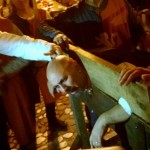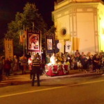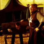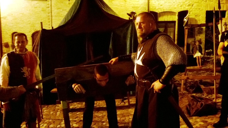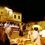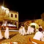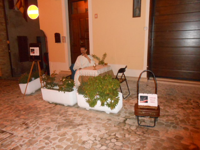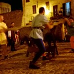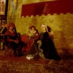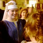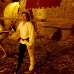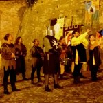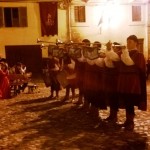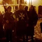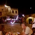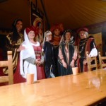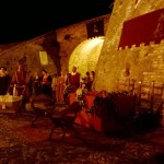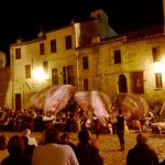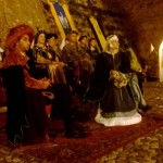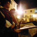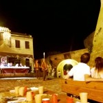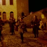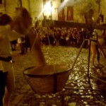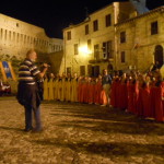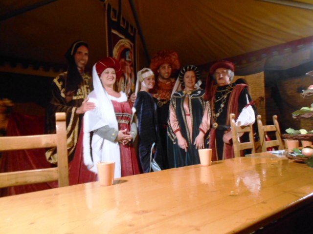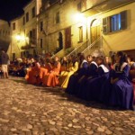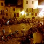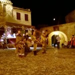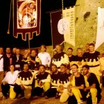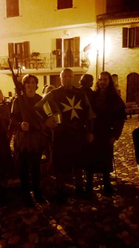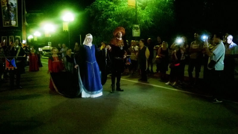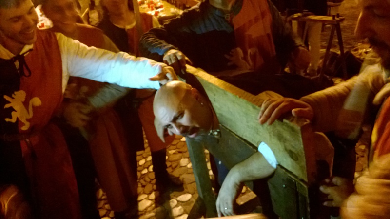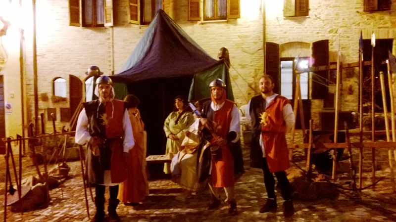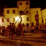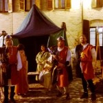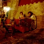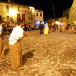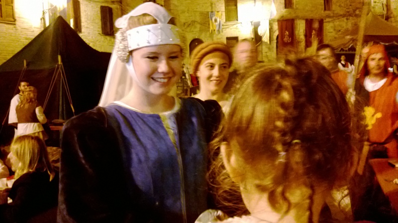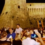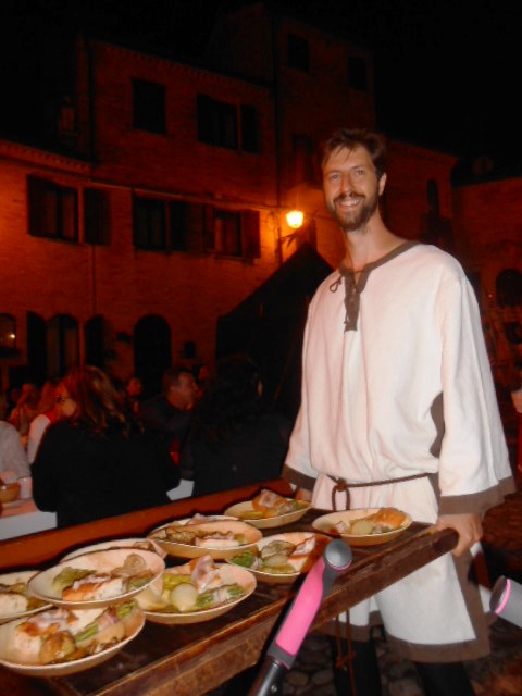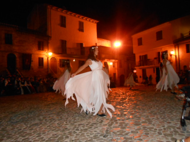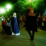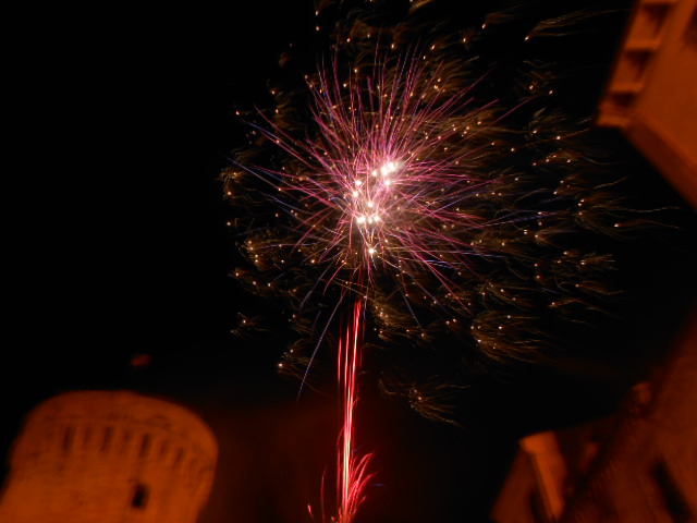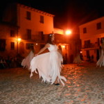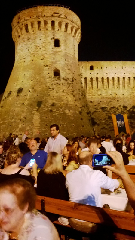 Infine domenica 3 agosto si è tenuto il rinomato Banchetto Nuziale in una nuova e suggestiva location: piazza del Forte, sotto la splendida Fortezza capolavoro del Pontelli. Cena bagnata, cena fortunata ha detto Fabio di Cocco, il giullare della serata, e tanto è stato: nonostante lo scroscio d’acqua iniziale organizzatori e partecipanti non si sono scoraggiati: appena smesso di piovere i camerieri si sono subito dati da fare per togliere le tovaglie bagnate e asciugare le panche nel minor tempo possibile, l’organizzazione ha saputo far fronte egregiamente all’inconveniente con molto senso pratico. I partecipanti alla cena, oltre 200, si sono potuti, quindi, accomodare di nuovo per iniziare la cena a partire dalla frutta e dal pinzimonio, come tutti gli anni, per poi gustare piatti come zuppa di ceci con vongole e gamberi o bocconcini di vitello con crema di fave, per nominare due tra le diverse deliziose pietanze preparate dal Catering Papillon, per terminare in dolcezza con i biscotti di Forasteria e il vino cotto. La serata è stata molto vivace grazie all’animazione degli Armigeri e Balestrieri di Bucchianico con la loro gogna che ha mietuto diverse vittime, degli Errabundi musici, della danzatrice del ventre Perla d’Oriente, dei Lux Arcana con il loro spettacolo di fuoco, dell’esibizione del balletto medievale delle alunne della maestra di danza Maria Luigia Neroni e del gioco del Mercante in Fiera dove come carte sono stati utilizzati dei disegni di personaggi del Palio realizzati dall’artista Cesare d’Antonio. Al termine del banchetto si è tenuto il tradizionale incendio della Fortezza, con uno spettacolo firmato Pirotecnica 2001, che ha concluso degnamente l’ultima serata dell’edizione 2014 di Sponsalia.