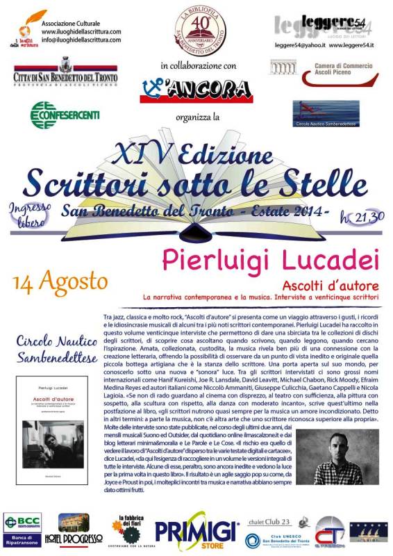 SAN BENEDETTO DEL TRONTO – Giovedì 14 agosto alle ore 21,30 si terrà, presso il Circolo Nautico di S. Benedetto, la prima presentazione ufficiale di “Ascolti d’autore”, libro che raccoglie venticinque interviste ad altrettanti scrittori italiani ed internazionali sul tema della musica, pubblicato nelle scorse settimane da Galaad Edizioni. Sarà presente l’autore, Pierluigi Lucadei, giornalista e critico musicale, che converserà con il giornalista del Messaggero Franco Cameli. L’incontro è inserito all’interno della XIV edizione di “Scrittori sotto le Stelle”, ciclo di appuntamenti organizzato da “La Bibliofila” di Mimmo Minuto.