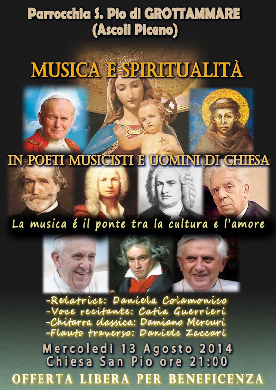 GROTTAMMARE – Il 13 agosto 2014 alle ore 21 nella Chiesa S. Pio di Grottammare l’Associazione culturale “Euterpe e le Altre” presenterà l’evento: “Musica e spiritualità in poeti, musicisti e uomini di Chiesa”, relatrice sarà la Pro.ssa Daniela Colamonico accompagnata nella sua esposizione dalla musica dal vivo del chitarrista classico Daniele Mercuri e dal flautista Daniele Zaccari, nonché da letture di poesie e brani da parte della voce recitante Catia Guerrieri.