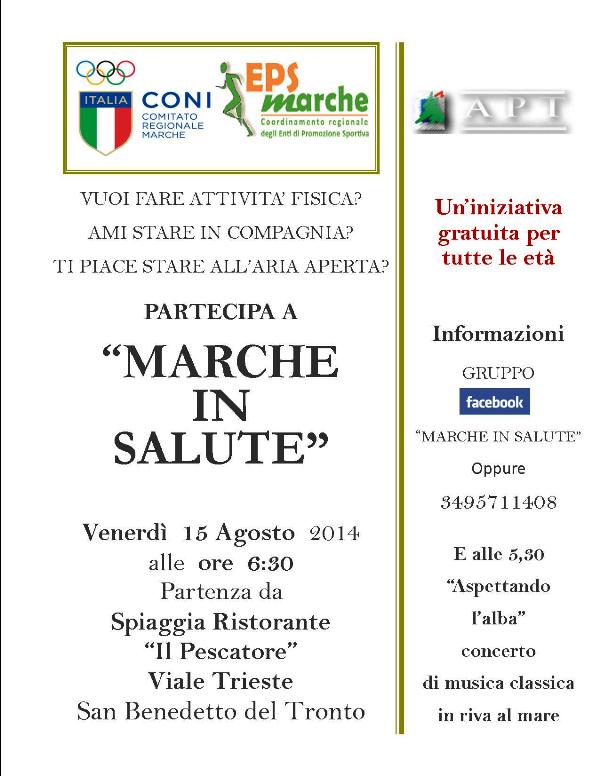 SAN BENEDETTO DEL TRONTO – Camminare per restare in salute. È lo spirito di “Marche in Salute”, progetto promosso dal Coni Marche in collaborazione con il coordinamento regionale degli enti di promozione sportiva, che fa tappa a San Benedetto del Tronto il 15 agosto alle ore 6,30 (partenza dalla battigia dello Chalet Il Pescatore).