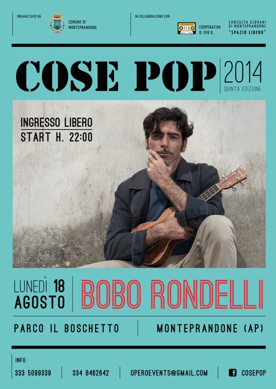 MONTEPRANDONE – Partito sulle note degli Afterhours, la Rassegna musicale “Cose Pop, Cose Musicali” di Monteprandone continua lunedì 18 agosto dalle ore 22:00 con il cantautore Bobo Rondelli, presso il parco pubblico Boschetto nel centro storico di Monteprandone ad ingresso gratuito.