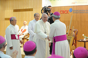 Concetti ripresi poco dopo, nella sede della Conferenza episcopale coreana (Cbck), per un incontro con i vescovi locali invitati ad “essere custodi della memoria e custodi della speranza”. Il Pontefice ha ricordato i martiri coreani che beatificherà il 16 agosto dai quali, ha affermato, “scaturisce un abbondante raccolto di grazia in questa terra”. Di questo raccolto fanno parte “parrocchie attive e movimenti ecclesiali, solidi programmi di catechesi, l’attenzione pastorale verso i giovani e nelle scuole cattoliche, nei seminari e nelle università”. Tuttavia “essere custodi della memoria” significa, per il Papa, “qualcosa di più che ricordare, significa anche trarne le risorse spirituali per affrontare con lungimiranza e determinazione le speranze, le promesse e le sfide del futuro. Essere custodi della memoria significa rendersi conto che la crescita viene da Dio. Guardare al passato senza ascoltare la chiamata di Dio alla conversione nel presente non ci aiuterà a proseguire il cammino; al contrario frenerà o addirittura arresterà il nostro progresso spirituale”. Ai vescovi coreani il Papa ha chiesto anche di essere “custodi della speranza, mantenendo viva la fiamma della santità e della carità fraterna e prendendosi cura dell’educazione dei giovani”, attraverso il sostegno dato alle università e alle scuole cattoliche di ogni grado. Un impegno ecclesiale che non può essere disgiunto dalla “sollecitudine per i poveri, per i rifugiati e i migranti”. Vivere e operare nel mezzo di una “società prospera ma sempre più secolarizzata e materialistica” come quella coreana pone sfide particolari alla testimonianza evangelica. La tentazione più grande, in tali circostanze, per gli operatori pastorali, è quella di “adottare uno stile di vita guidato più da criteri mondani di successo e persino di potere che dai criteri enunciati da Gesù nel Vangelo”. “Voglia il Cielo – sono state le ultime parole del Papa ai vescovi – che possiamo salvarci da quella mondanità spirituale e pastorale che soffoca lo Spirito”.