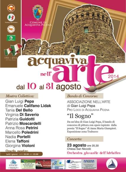 ACQUAVIVA PICENA – Si terrà questa sera alle 20:30 nella chiesa di San Niccolò la premiazione del concorso pittorico Il Sogno abbinato alla manifestazione Acquaviva nell’Arte, una mostra collettiva inaugurata il 10 agosto alla quale hanno partecipato con l’esposizione delle proprie opere gli artisti Gian Luigi Pepa, Emanuele Califano Lidak, Tanya Del Bello, Virginia Di Saverio, Patrizia Giudotti, Patrizio Moscardelli, Anna Rosa Petrini, Marcello Poledrini, Nadia Portelli, Elena Taffoni, Giorgina Violoni. Le opere sono state esposte presso la Madonna della Pietà, la galleria Trabucco, la Biblioteca Comunale e la chiesa di San Rocco e potranno essere visitate fino al 31 agosto tutte le sere dalle ore 20:00 alle ore 23:00, l’ingresso è libero. Presso il Trabucco sono state esposte anche le opere dei 23 artisti che hanno partecipato al concorso Il Sogno, dipingendo un quadro ispirandosi alla poesia Il Sogno scritta dalla pittrice e poetessa Anna Maria Giampieri. Le opere sono state sottoposte al giudizio della giuria popolare, che ha potuto votare visitando l’esposizione, e della giuria tecnica. Dopo la premiazione si terrà un concerto tenuto dall’O.G.A., Orchestra Giovanile dell’Adriatico, un’orchestra composta da studenti iscritti a scuole medie, superiori e università che si esibiscono insieme ai maestri Paolo Incicco, violino, Paolo Puca, flauto traverso, Mariacristina Vallese, pianoforte e il direttore Gian Paolo Corradetti; l’O.G.A. si proprone di “rispondere all’inclinazione musicale dei giovani di far musica insieme […] ha sviluppato e consolidato le abilità strumentali dei ragazzi, favorendo e incentivando la creatività e l’improvvisazione musicale”. Durante il concerto verrà eseguito un repertorio vario che andrà dal classico, Vivaldi e Mozart, al moderno, Yruma, Morricone, Modugno, ecc…