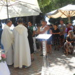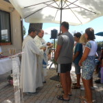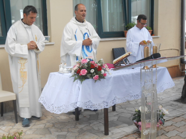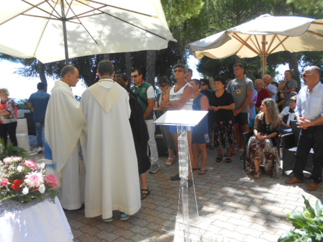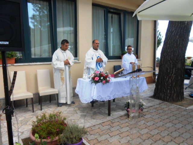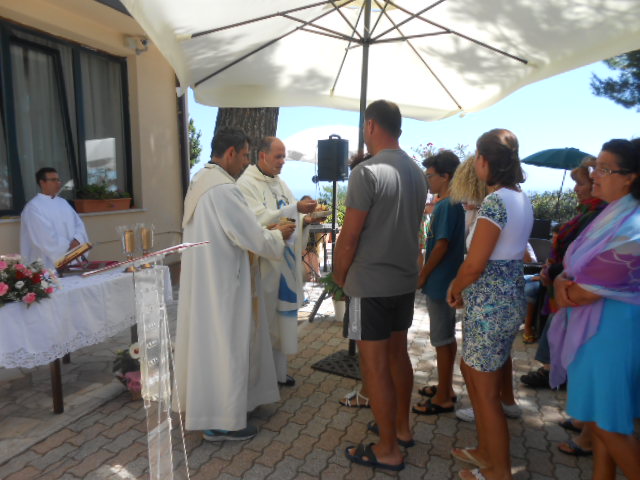 ACQUAVIVA PICENA – Venerdì 15 agosto, la celebrazione della messa delle 11:15 non si è tenuta nella chiesa parrocchiale, San Niccolò, ma in un luogo non consueto: l’Hotel Abbadetta, dove ultimamente sono ospitati alcuni dei tanti rifiugiati che giungono con i barconi lungo le nostre coste. La celebrazione dell’eucaristia è avvenuta all’esterno della struttura; il parroco don Alfredo, infatti, ha scelto l’ombra degli alberi del giardino per concelebrare la messa con il sacramentino Padre Genziani Antonio. Hanno partecipato sia i parrocchiani che gli ospiti dell’albergo che via via si sono uniti all’assemblea. Il 15 agosto viene ricordato il dogma dell’Assunta, una verità da credere e una vita da vivere, che ci ricorda che tutti noi possiamo imitare Maria, perché lei, così piccola, umile, semplice e giovane ha reso grande Dio portandolo nel suo grembo.