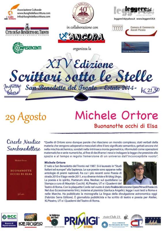 SAN BENEDETTO DEL TRONTO – Michele Ortore presenta “Buonanotte Occhi di Elsa” oggi 29 agosto ore 21,30 Circolo Nautico. Evento a cura della Bibliofila e dell’Associazione I luoghi della Scrittura. Conversa con lo scrittore la Professoressa Benedetta Trevisani.