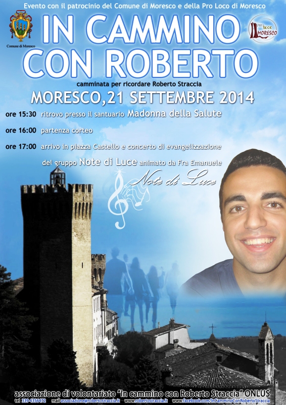 L’evento è patrocinato dal Comune Di Moresco e dalla Pro Loco di Moresco. Ulteriori informazioni possono essere ottenuto sull’evento facebook “In cammino con Roberto”.