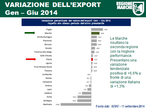 MARCHE – Continua il trend positivo per l’export marchigiano. In base ai dati relativi al I° semestre 2014, pubblicati oggi dall’Istat, le Marche registrano un +6,6% rispetto allo stesso periodo dell’anno precedente e la seconda posizione nella classifica nazionale delle regioni italiane per crescita dell’export.