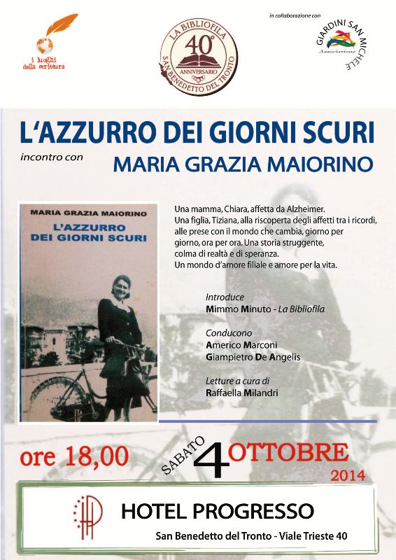 SAN BENEDETTO DEL TRONTO – Sabato, 4 Ottobre, ore 18,00 presso Hotel Progresso, lungomare di San Benedetto, si terrà un evento letterario dedicato ad un argomento delicato come quello dell’Alzheimer. L‘incontro è organizzato da La Bibliofila insieme con la scrittrice Maria Grazia Maiorino, autrice del libro che verrà presentato: L’azzurro dei giorni scuri.