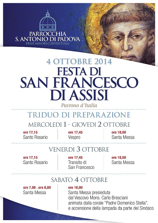 SAN BENEDETTO DEL TRONTO – Da oggi, mercoledì 1 ottobre, si terrà presso la Parrocchia Sant’Antonio da Padova il triduo in preparazione per la Festa di San Francesco D’Assisi Patrono d’Italia.