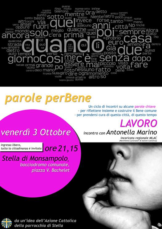 L’Azione Cattolica della parrocchia di Stella di Monsampolo ha inserito la parola lavoro, tra le Parole perBene. Un ciclo di incontri su alcune parole importanti per l’edificazione del bene comune e prendersi cura della città in questo tempo, che ha già sfogliato le parole come partecipazione, legalità, speranza, corresponsabilità. Venerdì 3 ottobre presso il Bocciodromo Comunale, piazza Bachelet, di Stella di Monsampolo, alle ore 21.15, la parola Lavoro sarà messa al centro con la responsabile regionale del Movimento Lavoratori di Azione Cattolica delle Marche: Antonella Marino. Il MLAC è accanto ai lavoratori e fa strada con loro, cura la formazione anche per sostenere un discernimento sulle vicende e sulle dinamiche socioeconomiche, perché la riflessione sul mondo del lavoro e sull’economia non può essere lasciato ai soli che si considerano gli “adetti ai lavoro” come finanzieri e economisti. Occorre un contributo di pensiero e presenza che rimetta al centro la persona con uno stile comunitario, come l’esperienza dell’associazionismo può indicare, perché il bene comune, la dignità della persona dovrebbero essere al centro di ogni riflessione e questione delle politiche economiche. Papa Francesco anche all’udienza al Pontificio Consiglio della Giustizia e della pace di oggi ha ricordato che il “lavoro non può essere considerato una variabile dipendente dai mercati finanziari e monetari. Esso è un bene fondamentale rispetto alla dignità, alla formazione di una famiglia, alla realizzazione del bene comune e della pace.”
