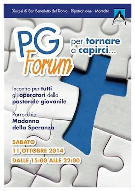 DIOCESI – E’ fissato per sabato 11 ottobre l’incontro organizzato dal Servizio diocesano di pastorale giovanile, che porta il nome di “PG Forum: per tornare a capirsi” e che avrà luogo nei locali della parrocchia Madonna della Speranza a Grottammare. L’incontro è rivolto a catechisti, educatori d’oratorio (non adolescenti), capi in servizio R\S , educatori ACG, responsabili degli ambiti giovanili di associazioni e movimenti, animatori sportivi, ma anche a tutti quelli che in questo nuovo anno pastorale iniziano il loro servizio con i giovanissimi e giovani.