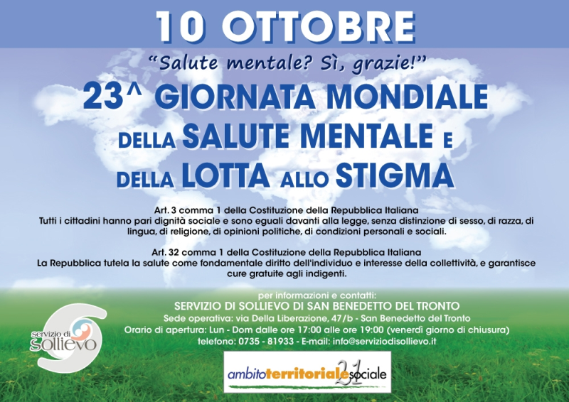 SAN BENEDETTO DEL TRONTO – Il 10 ottobre si celebra la 23esima edizione della “Giornata Mondiale della Salute Mentale”, organizzata dall’OMS (Organizzazione Mondiale della Sanità) con l’obiettivo di creare una consapevolezza maggiore nelle società attorno al tema della malattia mentale e del disagio psichico. Il tema dell’edizione 2014 della Giornata è “Vivere con la schizofrenia”. Il focus dell’OMS è far sì che le persone che vivono questo problema possano condurre un’esistenza il più possibile sana, nonostante la malattia.