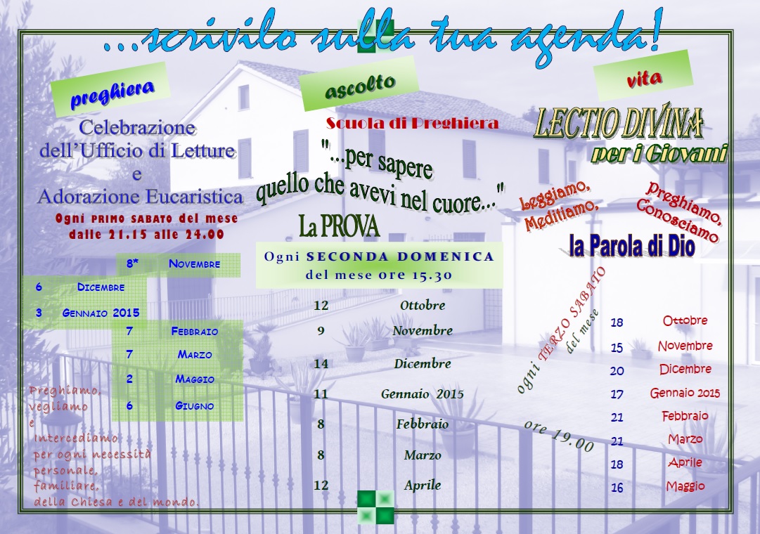 La prima serie di incontri si svolgerà ogni primo sabato del mese dalle ore 21:15 alle ore 24:00 e verranno celebrati l’ufficio delle Letture e l’adorazione Eucaristica.