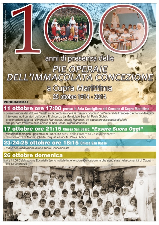 Noi lo iniziamo con la celebrazione della presenza centenaria delle Suore Pie Operaie dell’Immacolata Concezione a Cupra Marittima. Arrivarono il 25 ottobre 1914, prima casa, in assoluto, fuori di Ascoli dopo la fondazione ad opera del Venerabile Mons. Francesco Antonio Marcucci nel 1744.
