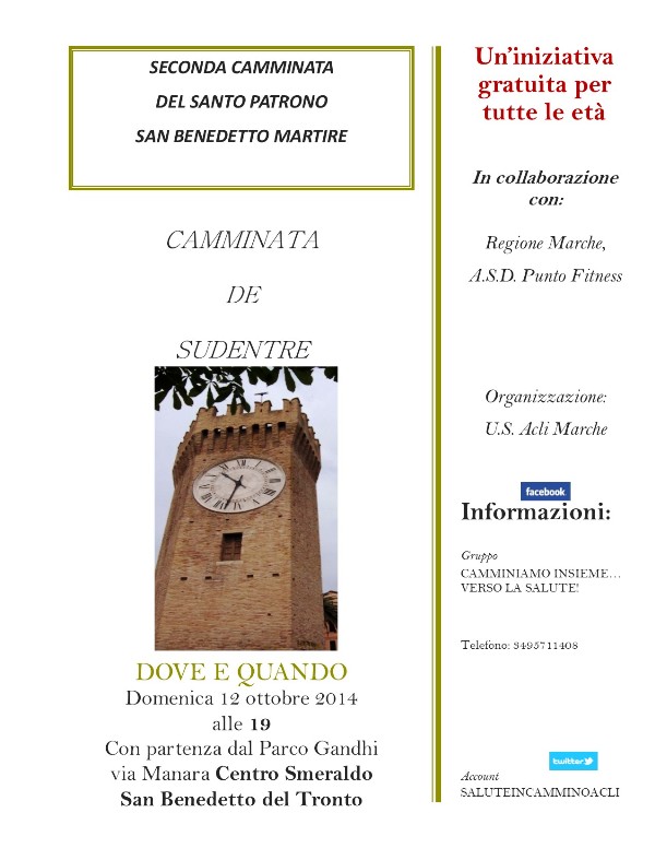 Domenica 12 ottobre, alle ore 19 con partenza dal Parco “Gandhi” nei presso del parcheggio del Centro commerciale “Smeraldo” in via Manara, avrà luogo la partenza di una iniziativa che lo scorso anno ha coinvolto molti cittadini e che ha dato loro di conoscere meglio la figura di San Benedetto Martire, di ammirare le bellezze presenti nella parte alta di San Benedetto del Tronto e di camminare per circa un’ora occupandosi della propria salute e del proprio benessere fisico.