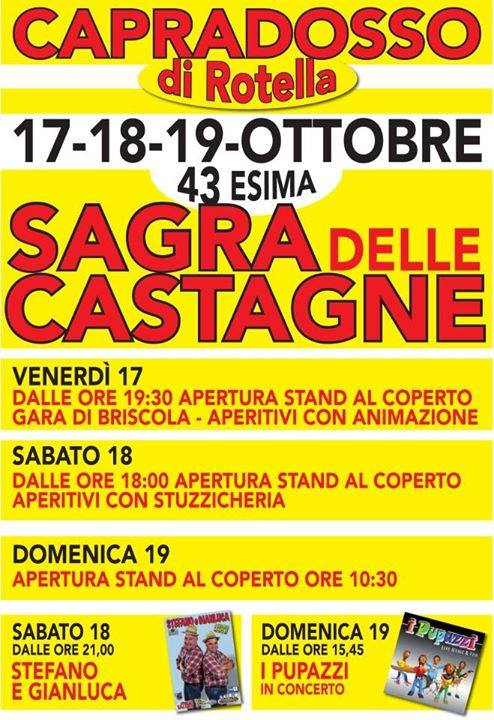 ROTELLA – Anche quest’anno a Capradosso di Rotella, dal 17 al 19 ottobre, si fa festa con la Sagra delle Castagne, ormai storico appuntamento che vede protagonista il frutto autunnale per eccellenza. Stands gastronomici con piatti eccellenti e animazione adatta a tutte le età, per tre giorni di divertimento e tradizione.