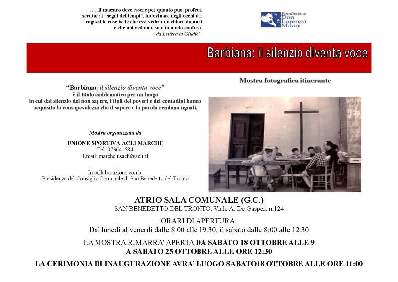 SAN BENEDETTO DEL TRONTO – Si aprirà sabato 18 ottobre, presso l’atrio della consiliare comunale, la mostra “Barbiana – Il silenzio diventa voce”, iniziativa dell’Unione Sportiva Acli – comitato regionale Marche – all’interno del progetto “Sport, sport cultura ed educazione interculturale attraverso lo sport” e grazie alla collaborazione della presidenza del consiglio comunale di San Benedetto del Tronto.