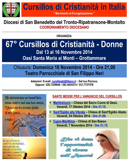 DIOCESI – Giovedì 13 Novembre avrà inizio il 67° Cursillos di Cristianità Donne che si terrà presso il convento dei frati dell’Oasi Santa Maria dei Monti d Grottammare e si concluderà alle ore 21.00 di Domenica 16 Novembre con l’accoglienza delle nuove sorelle presso il teatro Parrocchiale San Filippo Neri di San Benedetto del Tronto.