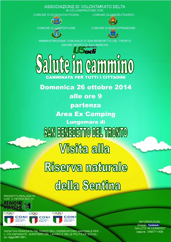 SAN BENEDETTO DEL TRONTO – A distanza di un anno il progetto “Salute in cammino” torna alla Riserva naturale della Sentina. E lo fa in occasione di “Lasciamo l’auto a casa”, iniziativa dell’assessorato alla mobilità del Comune di San Benedetto del Tronto domenica 26 ottobre. Lo scorso anno furono più di 100 i partecipanti all’iniziativa ed anche per quest’anno si prevede una forte partecipazione di podisti. L’appuntamento per la partenza è fissato per le ore 9 dall’Area Ex camping sul Lungomare di San Benedetto del Tronto. Da lì ci si dirigerà verso la Riserva naturale della Sentina dove è prevista una
