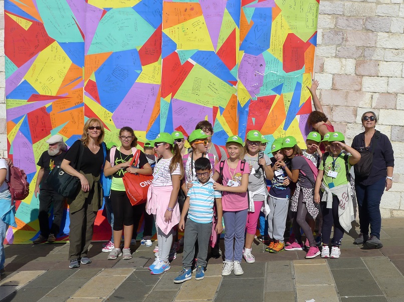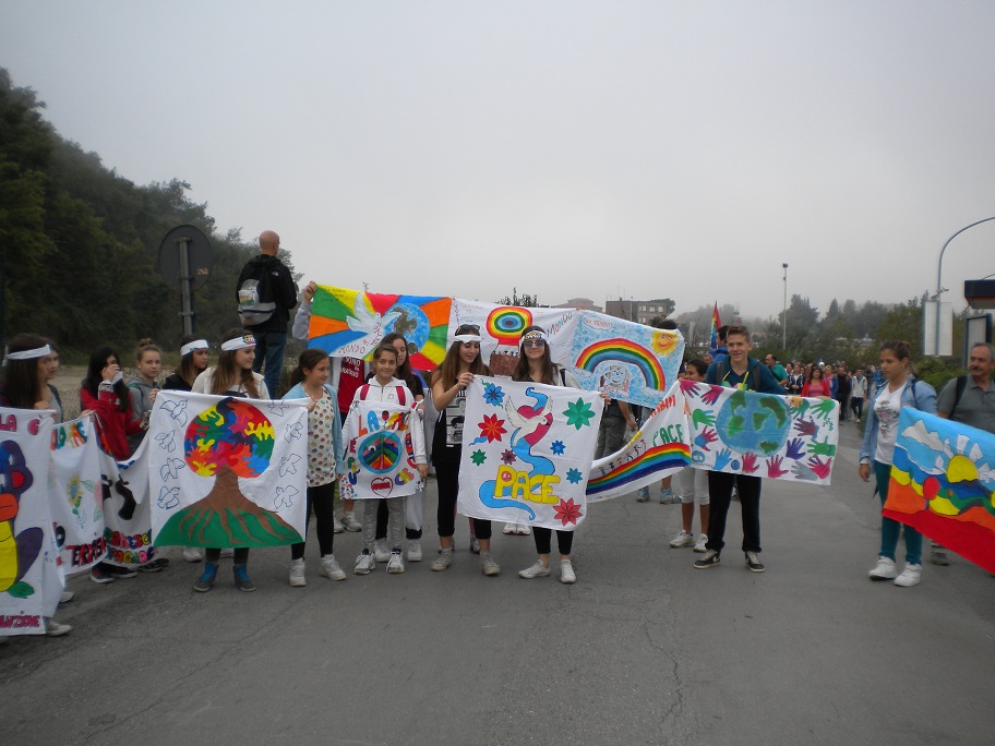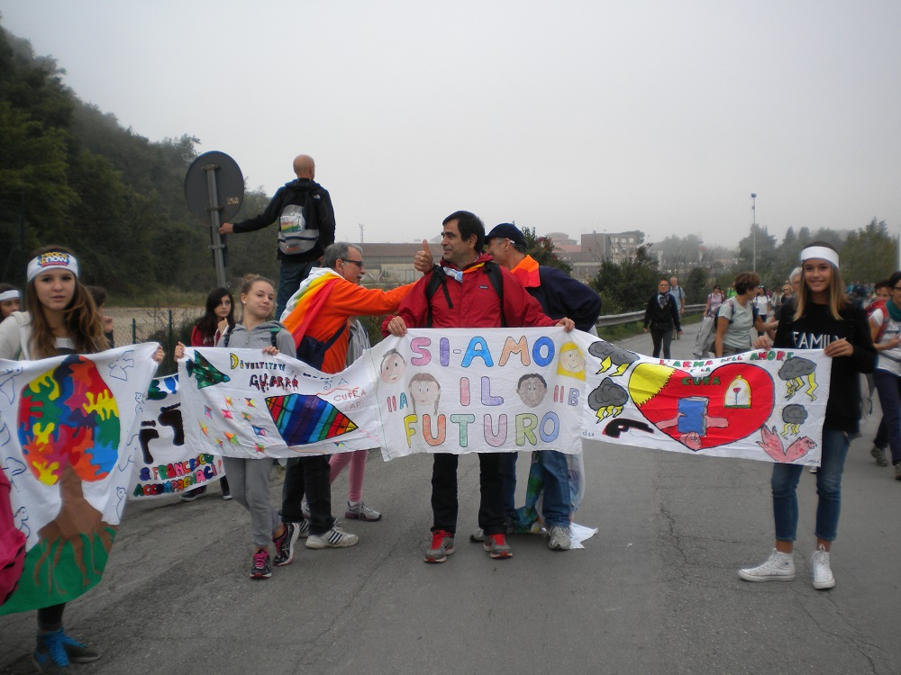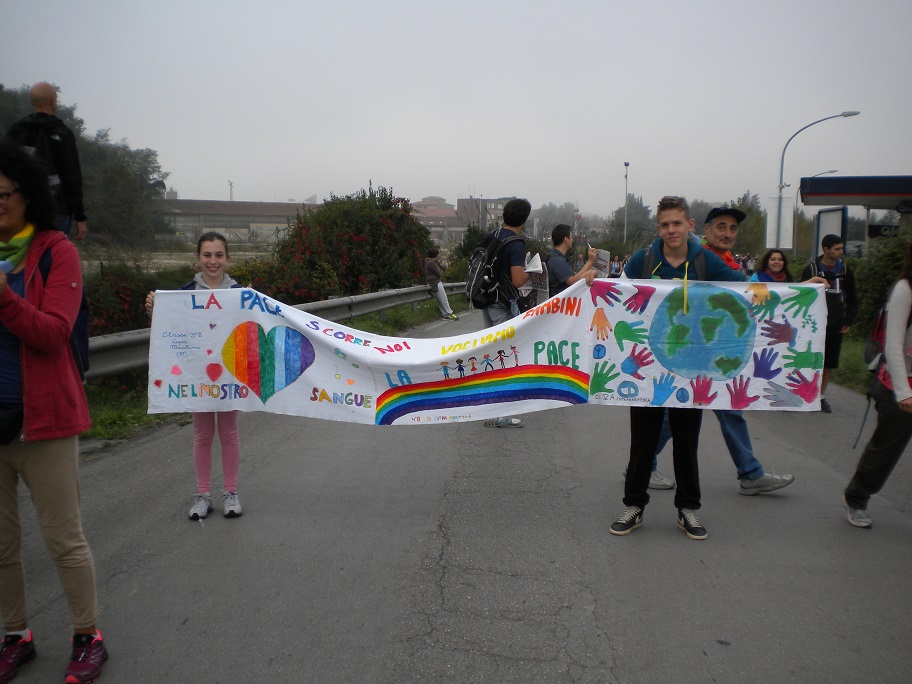 Con noi, i bambini della 5^B della scuola primaria B. Piacentini dell’ISC Centro di San Benedetto Tr. che hanno percorso solo l’ultimo tratto della Marcia, portando gli striscioni con i messaggi di pace dei ragazzi della scuola media M.Curzi. Al mattino si sono impegnati nelle attività di animazione in Piazza S. Francesco collaborando alla costruzione del grande murale dei Bambini d’Italia: “Abbiamo diritto di vivere in pace”.