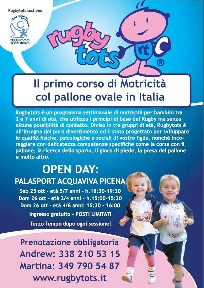 ACQUAVIVA PICENA – Sabato 25 e domenica 26 ottobre al palazzetto di Acquaviva Picena si terrà una lezione gratuita per presentare il primo corso di motricità col pallone ovale in Italia! Di tutto il centro Italia Acquaviva e’ il primo paese a ospitare questa nuova attività sportiva e per tutti i bambini da 2 a 7 anni e’ un’occasione di divertimento da provare! Rugbytots e’ un programma settimanale di motricità per bambini tra i 2 e 7 anni di età che utilizza i principi di base del rugby ma senza alcuna possibilità di contatto. Diviso in 3 gruppi di età, Rugbytots e’ all’insegna del puro divertimento ed è’ stato progettato per sviluppare le qualità fisiche, psicologiche e sociali dei bambini, nonché per incoraggiare con delicatezza competenze specifiche come la corsa con il pallone, la ricerca dello spazio, il gioco di piede, la presa del pallone e molto altro!