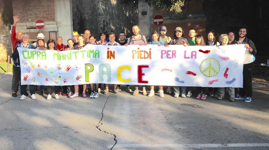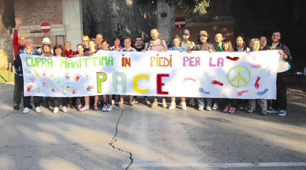 CUPRA MARITTIMA – Era numeroso e motivato il gruppo partito domenica 19 ottobre da Cupra Marittima, e diretto a Perugia per partecipare alla “Marcia della Pace Perugia – Assisi”, a cui (secondo i dati ufficiali) hanno preso parte circa centomila persone, 525 città di tutte le regioni italiane, 115 scuole, 275 enti locali e 478 associazioni.NLa manifestazione è stata aperta da una gigantesca bandiera con i colori dell’iride della pace. Il tema scelto per quest’anno è stato “Cento anni di guerre bastano”, dato che proprio quest’anno ricorrono i cento anni dallo scoppio della prima guerra mondiale.
