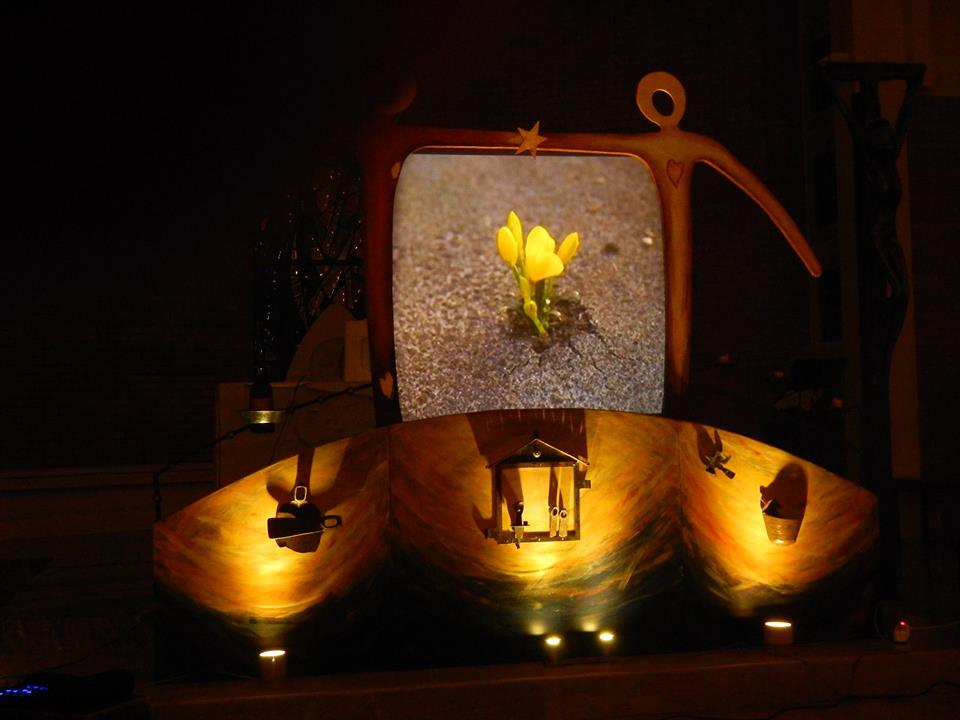 La preghiera è cadenzata dalla Parola, dalla musica e da canti appositamente scritti, dalle parole di don Luigi ricche di percorsi di riflessione e di vita vissuta, dall’arte che spazia dalle immagini ai video, con una scenografia come parte integrante della veglia, fatta di materiali di recupero per vere opere d’arte. Occasione quindi di parlare e scoprire un Dio tenero e misericordioso, come il bacio sulle ferite; quello su ogni giorno per tornare a baciare la quotidianità e tornare a percepire e amare gli spazi che abitiamo; il bacio di ogni inizio perché il ricominciare è uno dei doni più belli della vita possibile grazie al credito di fiducia di Dio. A conclusione dell’intensa e coinvolgente atmosfera che le diverse forme artistiche proposte, le parole di don Luigi riescono a creare, è stata donata a tutti i presenti una mandorla da poter mangiare. Il mandorlo è il primo che fiorisce e l’ultimo che dà i frutti tra gli alberi, e proprio un mandorlo don Luigi, all’inizio del suo sogno di Romena, aveva piantato vicino la pieve, segno che il cambiamento è cominciare a fiorire, senza l’aspettare e la fretta di avere i frutti. Un’iniezione di tenerezza e fiducia perché “Dio quando ama fa gesti molto umani. L’uomo quando ama fa gesti molto divini.” Qui puoi scaricare il libretto della veglia e i canti.