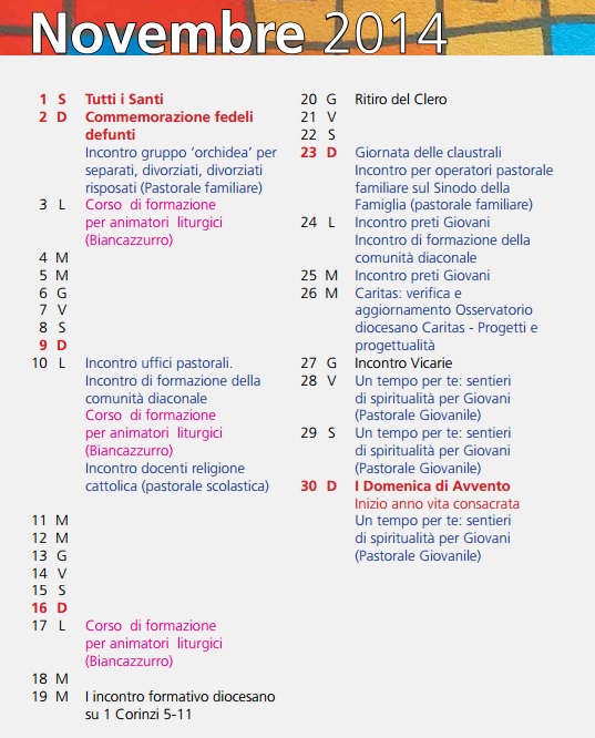 DIOCESI – Pubblichiamo tutti gli impegni ufficiali della nostra diocesi per il mese di Novembre.