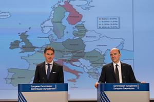 “La situazione economica e dell’occupazione non sta migliorando con sufficiente rapidità”, dice, quasi timidamente, Jyrki Katainen, finlandese schivo e matematico, da quattro giorni vicepresidente della Commissione Ue con il compito di coordinare gli sforzi per creare crescita, investimenti e competitività. Quasi una “mission impossible” in un’Europa del “mercato unico” la cui economia è sostanzialmente al palo, come spiegano le “Previsioni economiche d’autunno” rese note oggi al Palazzo Berlaymont. E se il messaggio non fosse sufficientemente chiaro, si fa avanti Pierre Moscovici, commissario per gli affari economici e finanziari, francese, eloquio sciolto e signorile: “Non vi è una soluzione semplice e univoca alle sfide che l’economia europea deve fronteggiare. Non c’è una bacchetta magica”. Eppure non tutto è perduto: in economia contano azioni concrete e clima di fiducia, tanto è vero che Moscovici avverte: “Dobbiamo agire su tre fronti. Predisporre politiche di bilancio credibili, intraprendere riforme strutturali ambiziose; realizzare investimenti sia pubblici che privati, elemento assolutamente necessario”. Non manca quindi un cenno al “Piano Juncker” – sul quale per ora vige il massimo riserbo – per mettere sul tavolo 300 miliardi di investimenti, che dovranno però essere accompagnati, secondo Bruxelles, da riforme serie e indilazionabili, di competenza degli Stati aderenti all’Unione. Dopo l’“omelia”, arrivano però i dati, piuttosto scoraggianti nel loro insieme. L’Esecutivo pronostica in effetti “una crescita debole per il resto di quest’anno, sia nell’Ue che nella zona euro”. Per il 2014 la crescita del Pil reale “dovrebbe raggiungere l’1,3% nell’Unione e lo 0,8% nella zona euro”, per poi “salire lentamente nel corso del 2015, rispettivamente all’1,5% e all’1,1%, trainata da una maggiore domanda interna ed estera”. Il 2016 riserverebbe – ma il condizionale è d’obbligo – una “accelerazione della crescita”, per portare il Pil attorno al 2,0%.
