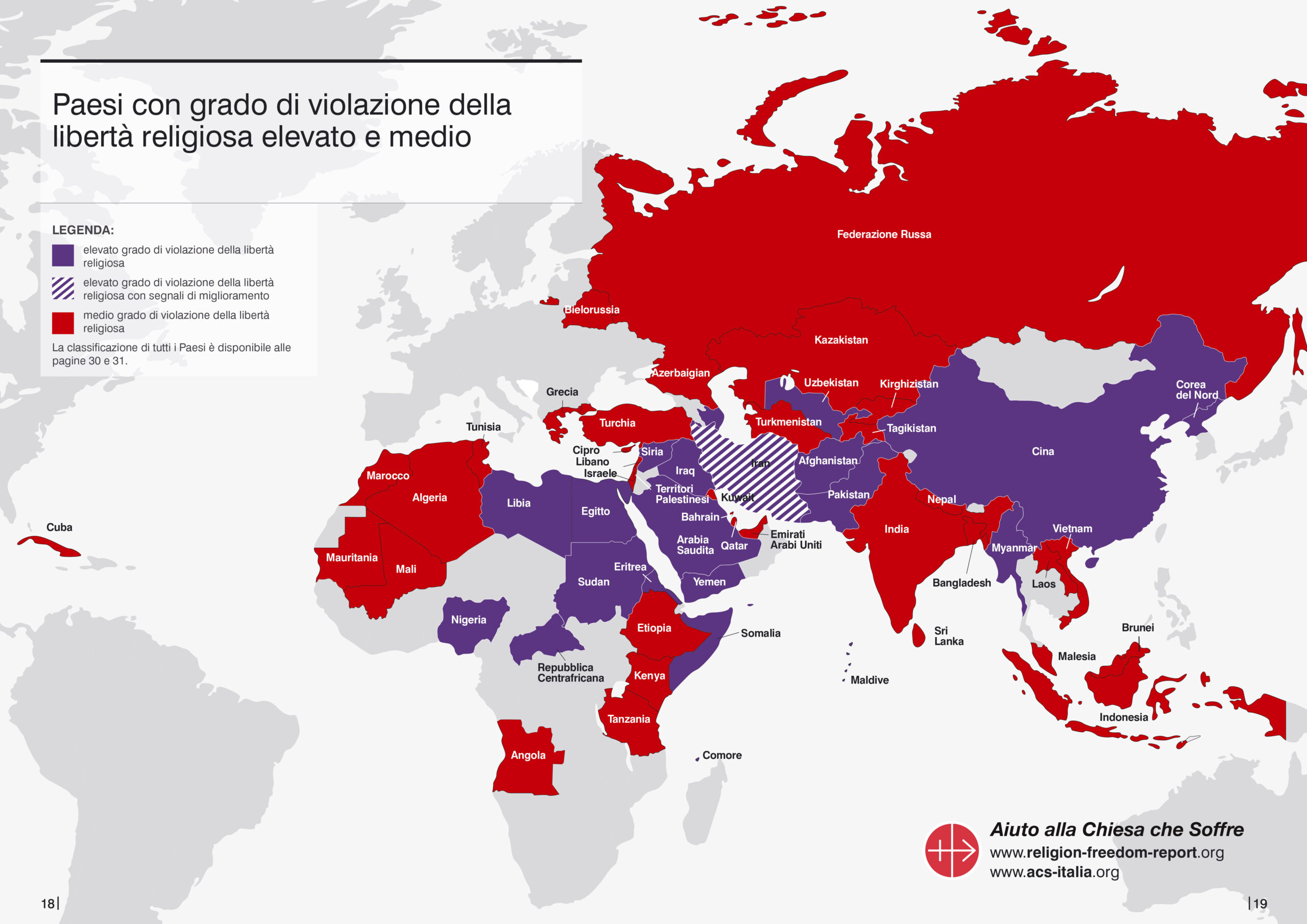 Nella “mappa” geografica disegnata dall’Acs, 81 dei 196 paesi del mondo (41%) vengono identificati come luoghi in cui la libertà religiosa è compromessa o è in declino. Per un totale di 35 paesi (18%) sono state rilevate istanze “preoccupanti” mentre 20 sono i Paesi identificati come luoghi di “elevato” grado di violazione della libertà religiosa, dove cioè la libertà religiosa non esiste. In 14 di questi Paesi, la persecuzione è a sfondo religioso ed è legata all’estremismo islamico (Afghanistan, Arabia Saudita, Egitto, Iran, Iraq, Libia, Maldive, Nigeria, Pakistan, Repubblica Centrafricana, Siria, Somalia, Sudan e Yemen). Negli altri 6 Paesi, la persecuzione religiosa è perpetrata da regimi autoritari (Azerbaigian, Myanmar, Cina, Corea del Nord, Eritrea e Uzbekistan). Nel delineare alcune vie di risoluzione del problema, Sefton-Williams ha chiamato in causa il ruolo delle comunità religiose stesse. In questo senso sono da apprezzare iniziative come quella presa recentemente dai 122 saggi musulmani che hanno rivolto al leader dell’Isis una lunga lettera per dichiarare che quanto lo Stato islamico sta facendo in Medio Oriente è contrario ai precetti di un Islam autentico.