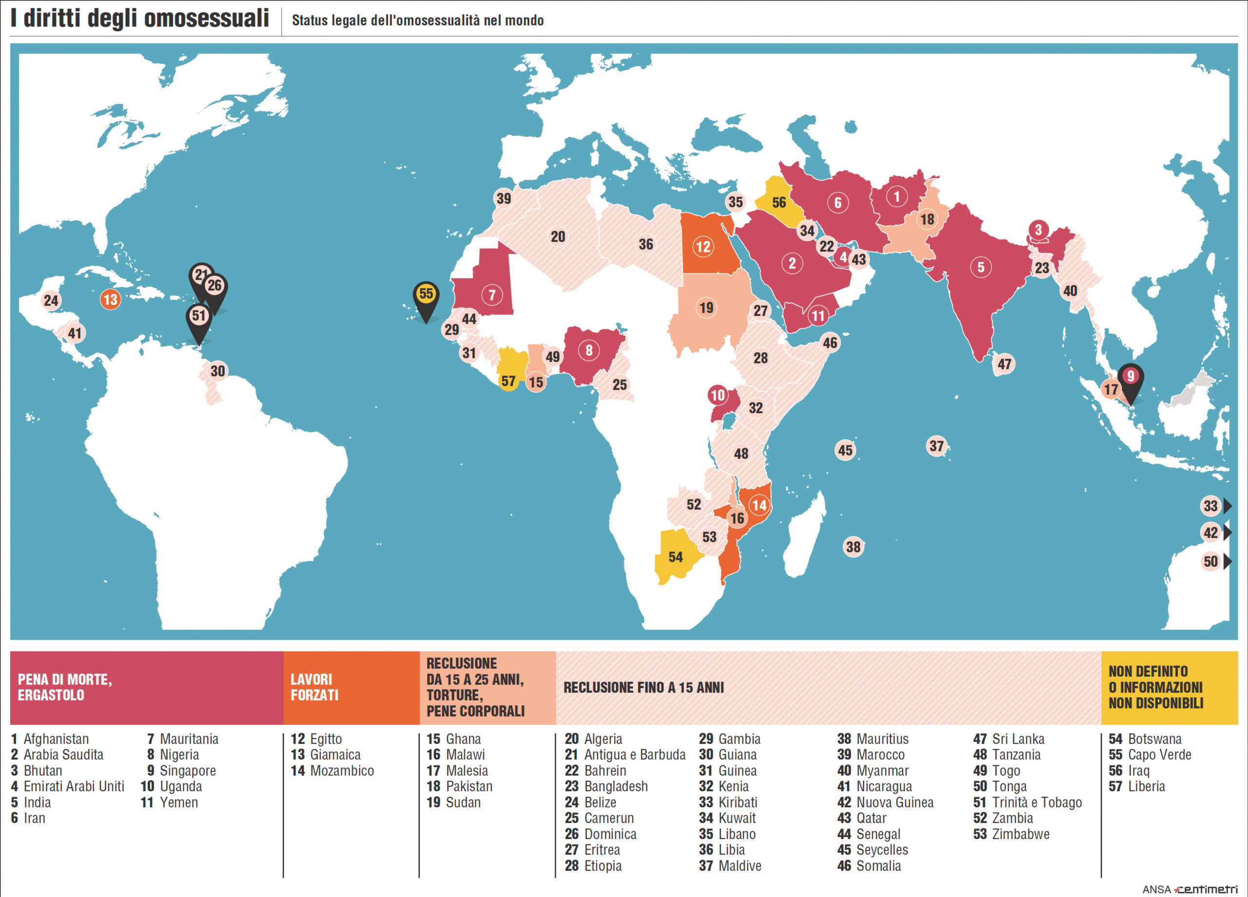 Le dure previsioni in Asia e Centroamerica. Lasciando l’Africa, questo triste elenco prosegue con alcuni Paesi dell’area mediorientale, in particolare quelli dove viene applicata la Sharia come legge di stato. I peggiori sono Afghanistan, Arabia Saudita, Emirati Arabi Uniti, Iran, Iraq (nel dopo Saddam Hussein), Turkmenistan e Yemen, che prevedono la pena di morte come massima punizione per l’esercizio dell’omosessualità. La reclusione fino a 10 anni, invece, è prevista in Bahrein, fino a 7 anni in Qatar, mentre pene minori (fino ad un massimo di 3 anni di reclusione) sono comminate in Libano, Siria, Oman, Pakistan, Tagikistan, Uzbekistan. Tra i Paesi dell’area asiatica orientale ed estremo-orientale, la normativa di India, Bhutan e Singapore prevede il carcere a vita, la Malesia la reclusione fino a 20 anni (ma in alcuni luoghi si applica la Sharia con la pena capitale), mentre le leggi di Bangladesh, Brunei, Myanmar, Sri Lanka e Maldive prevedono pene fino a 10 anni di carcere. Spostiamoci adesso nell’area del Centro America. Le sanzioni reclusive più pesanti sono previste alle Barbados e a Turks e Caicos (ergastolo), seguite da Antigua e Barbuda (fino a 15 anni). Pene molto gravose anche a Belize, Grenada, Santa Lucia, Saint Vincent e Grenadines, Trinidad e Tobago (fino a 10 anni), mentre a Dominica l’alternativa alla reclusione (fino a 10 anni) per le persone omosessuali è l’internamento in clinica psichiatrica. Giamaica, Saint Kitts e Nevis, poi, possono comminare una pena fino a 10 anni di lavori forzati. Le pene carcerarie più lievi sono invece previste in Nicaragua (fino a 3 anni), Cuba ( fino ad 1 anno), Costa Rica e le Isole Cayman (1 mese). Infine, a completamento di questa carrellata, citiamo le sanzioni previste dalla normativa di alcuni paesi e isole dell’Oceania, come Papua Nuova Guinea, Isole Solomone, Kiribati e Nauru (reclusione o lavori forzati fino a 14 anni), Marshall e Palau (reclusione fino a 10 anni), Cook, Samoa Ovest e isole Mauritius (reclusione fino a 5 anni), mentre in Polinesia troviamo Tuvalu (fino a 14 anni) e Tonga (fino a 10 anni).