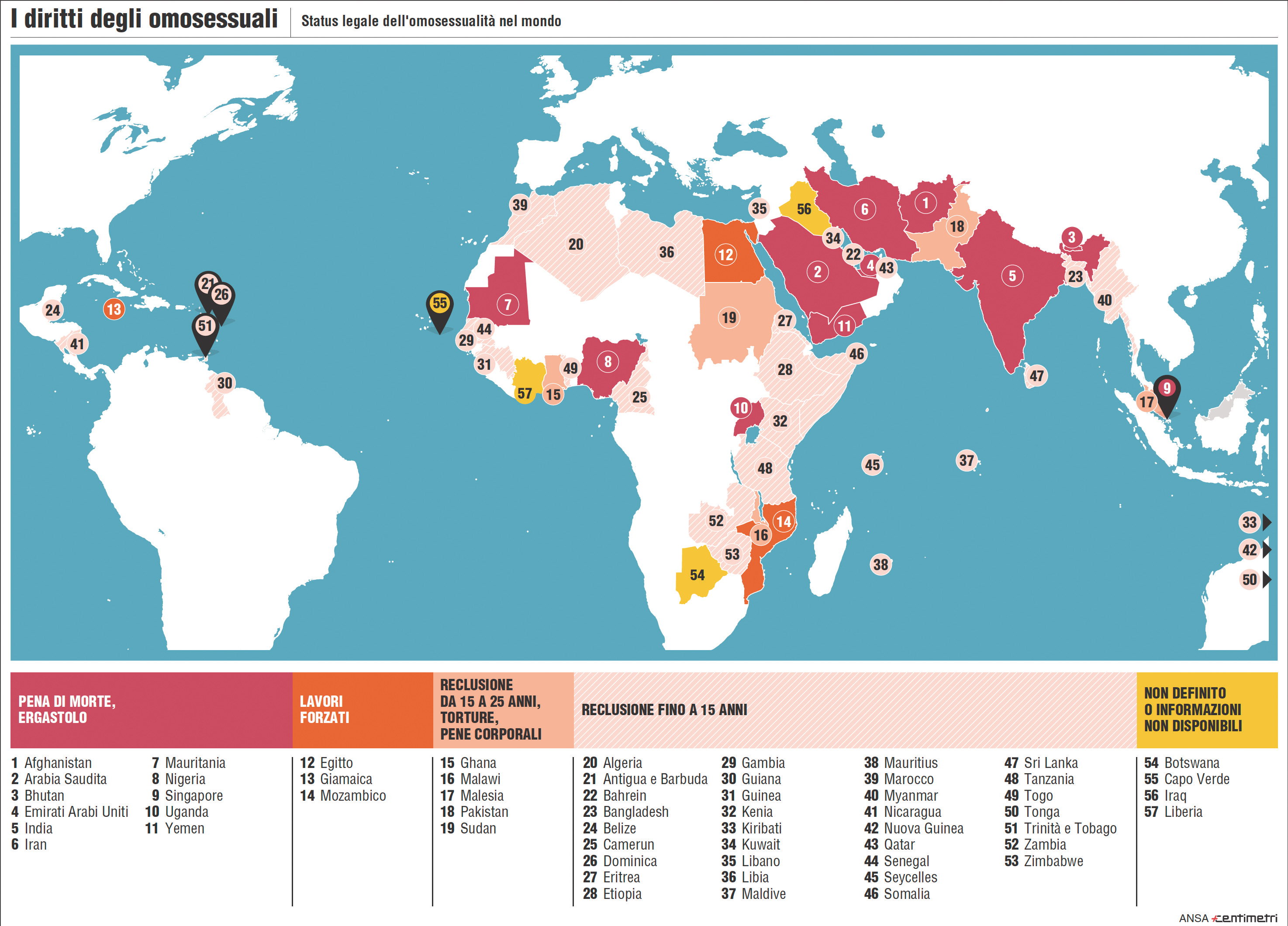 Dove permane l’omofobia: Africa. La “maglia nera” per l’omofobia normativa spetta tuttora al continente africano: in ben 37 dei suoi 54 Paesi, infatti, in particolare nella zona sub-sahariana, vigono ancora norme che inquadrano l’esercizio dell’omosessualità come reato penale, e in ben 30 di questi Paesi viene realmente applicato l’apparato sanzionatorio previsto. Le pene sono in genere molto pesanti, dalla detenzione per periodi variabili (da pochi mesi fino all’ergastolo), passando per i lavori forzati e le pene corporali, fino alla pena di morte. Entrando nel dettaglio, la pena capitale è attualmente prevista in Mauritania, Sudan e Nigeria (dove si applica la Sharia); in Uganda invece è previsto il carcere a vita, mentre in Ghana la reclusione fino a 25 anni (vi sono anche notizie di torture fisiche). Egitto, Mozambico e Sao Tomé prevedono l’avviamento ai lavori forzati, mentre pene reclusive fino a 14 anni sono comminate in Gambia, Malawi, Kenia, Botswana, Seychelles, Tanzania, Zimbabwe e Zambia. Infine, pene un po’ più lievi (fino a 5 anni di reclusione) sono previste in Algeria, Camerun, Capo Verde, Eritrea, Etiopia, Gibuti, Guinea, Liberia, Libia, Marocco, Senegal, Somalia, Togo e Tunisia.