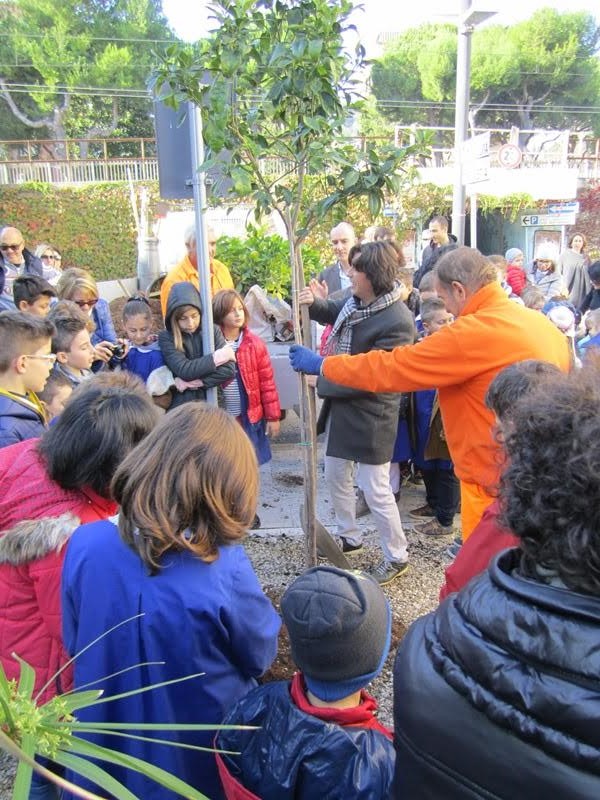La manifestazione è iniziata in piazza Kursaal a metà mattina, con i saluti alle classi partecipanti (l’ultimo anno della Scuola dell’infanzia e le classi quinte della Scuola primaria) prima della messa a dimora del primo alberello di arancio nella pineta a nord della palazzina comunale. Le classi partecipanti hanno raggiunto poi via Garibaldi, dove è avvenuta la messa a dimora del secondo albero di arancio, prima di rientrare nelle rispettive sedi didattiche.