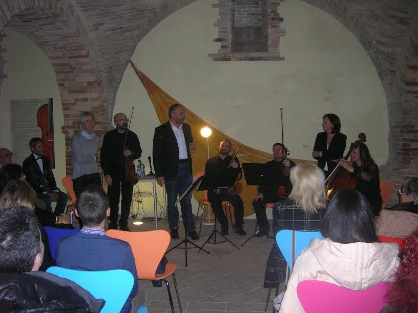 In serata, nella sala della Poesia di Palazzo Piacentini al Paese Alto, la musica ha avuto un ruolo centrale. Infatti il quartetto “Antonio Vivaldi” composto da Piergiorgio Troilo (violino), Alberto Fabiani (violino), Emiliano Finucci (viola) e Daniela Tremaroli (violoncello) si è esibito eseguendo brani tratti da istituzioni culturali dei paesi che si affacciano sull’Adriatico. A brani italiani (Antonio Vivaldi, Giuseppe Tartini, Stefano Travaglini) si sono alternati brani di autori sloveni e croati (Ivan Mane Jarnović) rintracciati grazie ad una particolareggiata ricerca storica curata da “I Solisti Piceni”.
